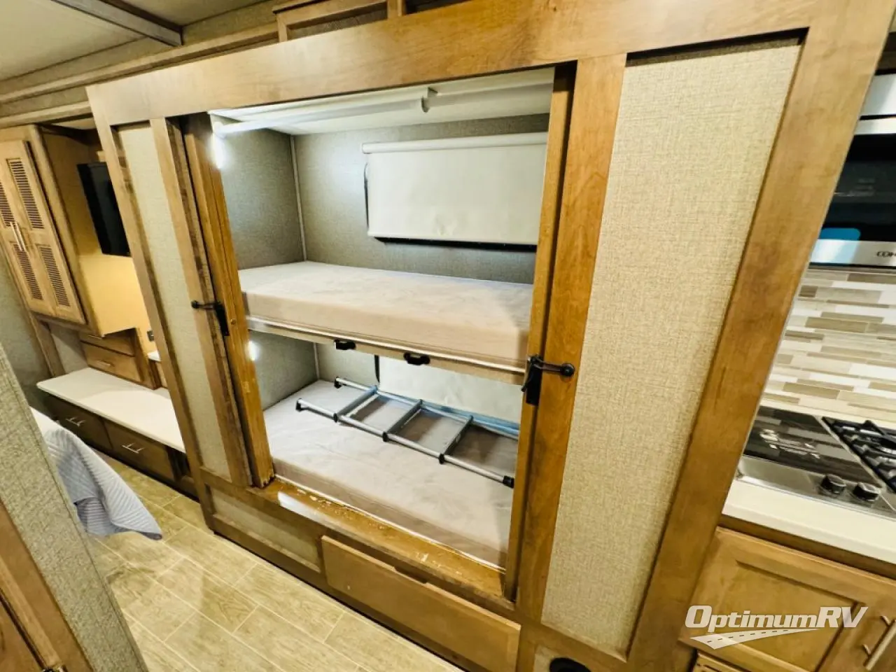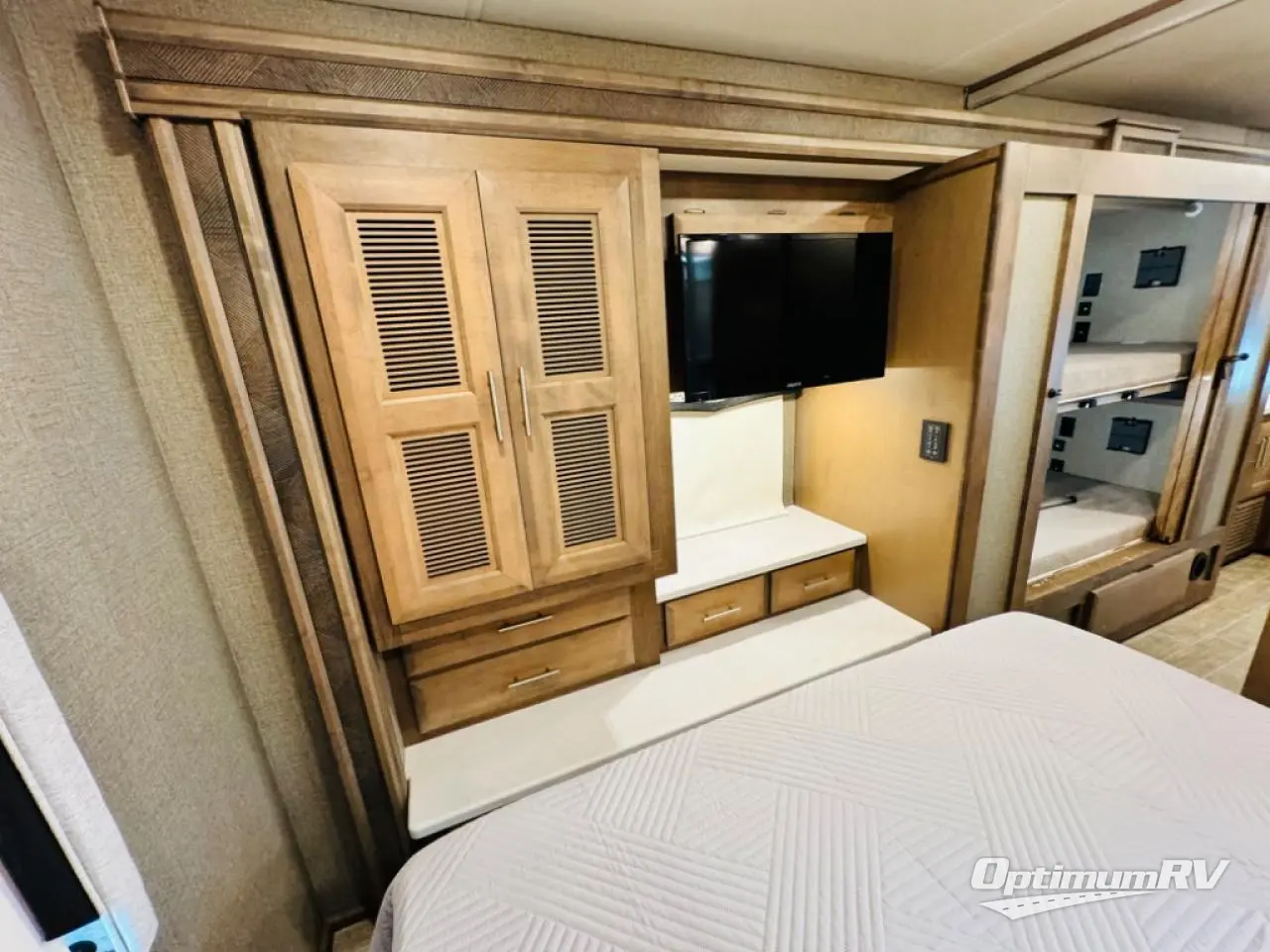 Pack your bags and load up into this luxurious Omni Super C diesel motorhome! You will feel right at home sleeping on the RV queen bed and watching your favorite movie on the 32" TV in the bedroom, plus there is an area in the wardrobe to add the optional washer and dryer. The grandkids can sleep on the 26" x 72" bunk beds that can convert into a closet, and they can also use the 59" x 80" bunk over the cab. You can even transform the 70" Dream dinette into a sleeping space too. There is plenty of entertainment inside and out with the exterior 32" TV, plus there is an exterior kitchen so that you can prepare dinner while breathing in fresh air and watching the kids play!