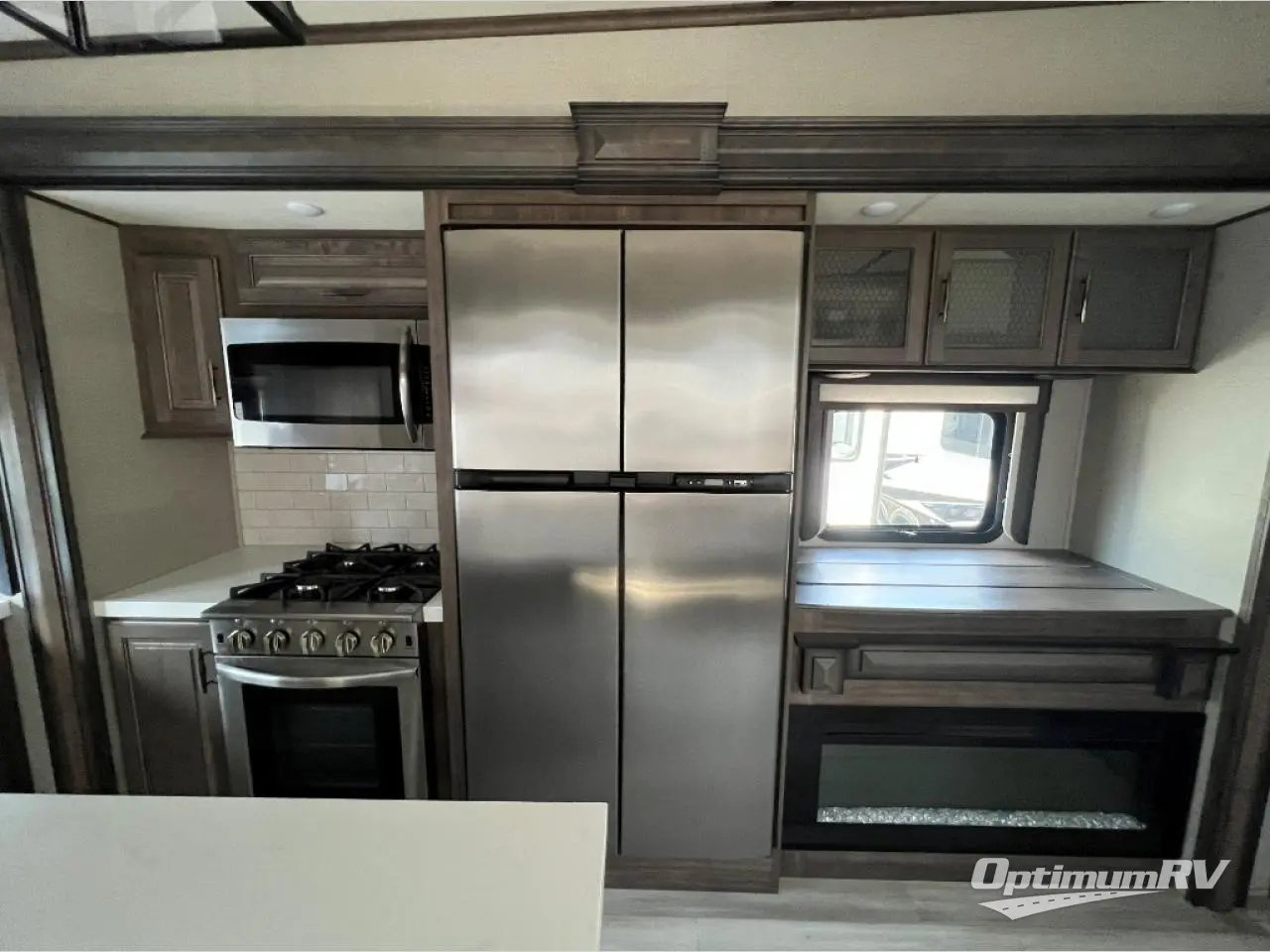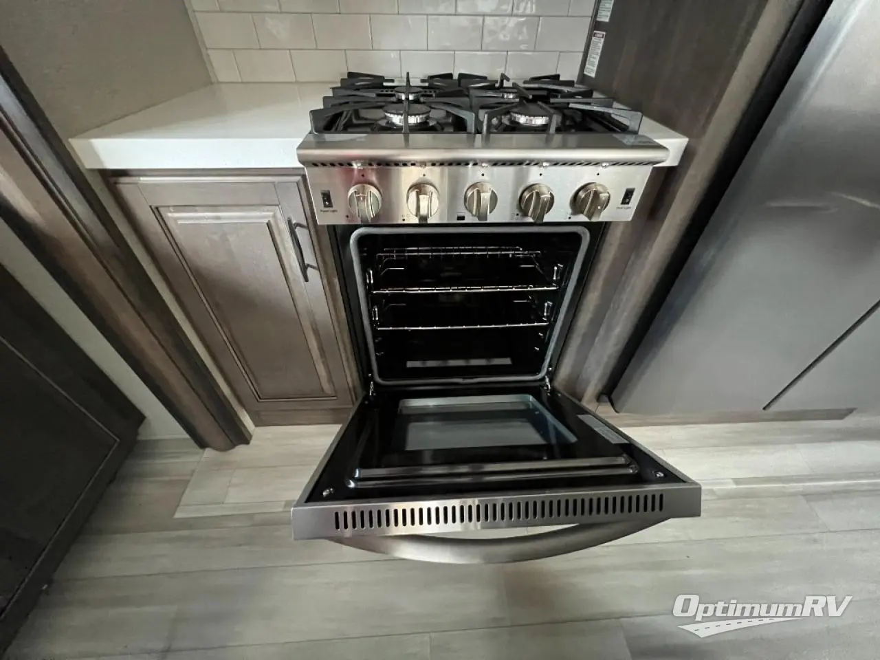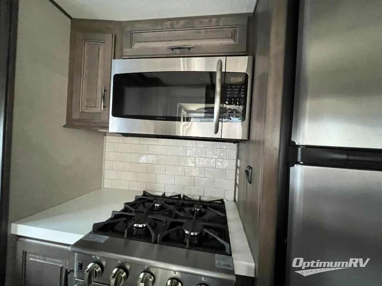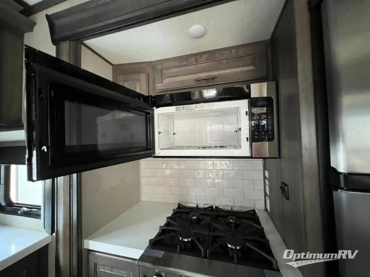 This fifth wheel offers a rear kitchen for the chef in the family to enjoy cooking while away from home! There is extra counter space along the rear wall and an oversized pantry to hold lots of goodies, plus one of the slides in this main living and kitchen area offers a professional-grade stainless steel cooktop with built-in oven, a microwave, a stainless steel residential refrigerator and a center island with a space to add a dishwasher option. The hutch/buffet give you even more counter and storage space, plus you might like to add a washer/dryer option to keep everything clean. The coat closet is near the entry for quick storage once inside, and the bathroom/bedroom slide provides more storage and the bath sink, plus more floor space in each room. You will sleep like a queen or choose the king option, and be able to watch the 32" LED TV before bedtime.