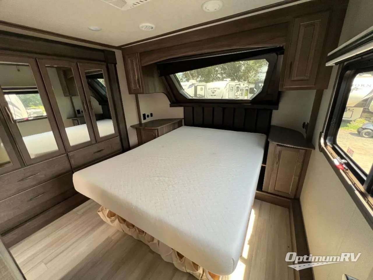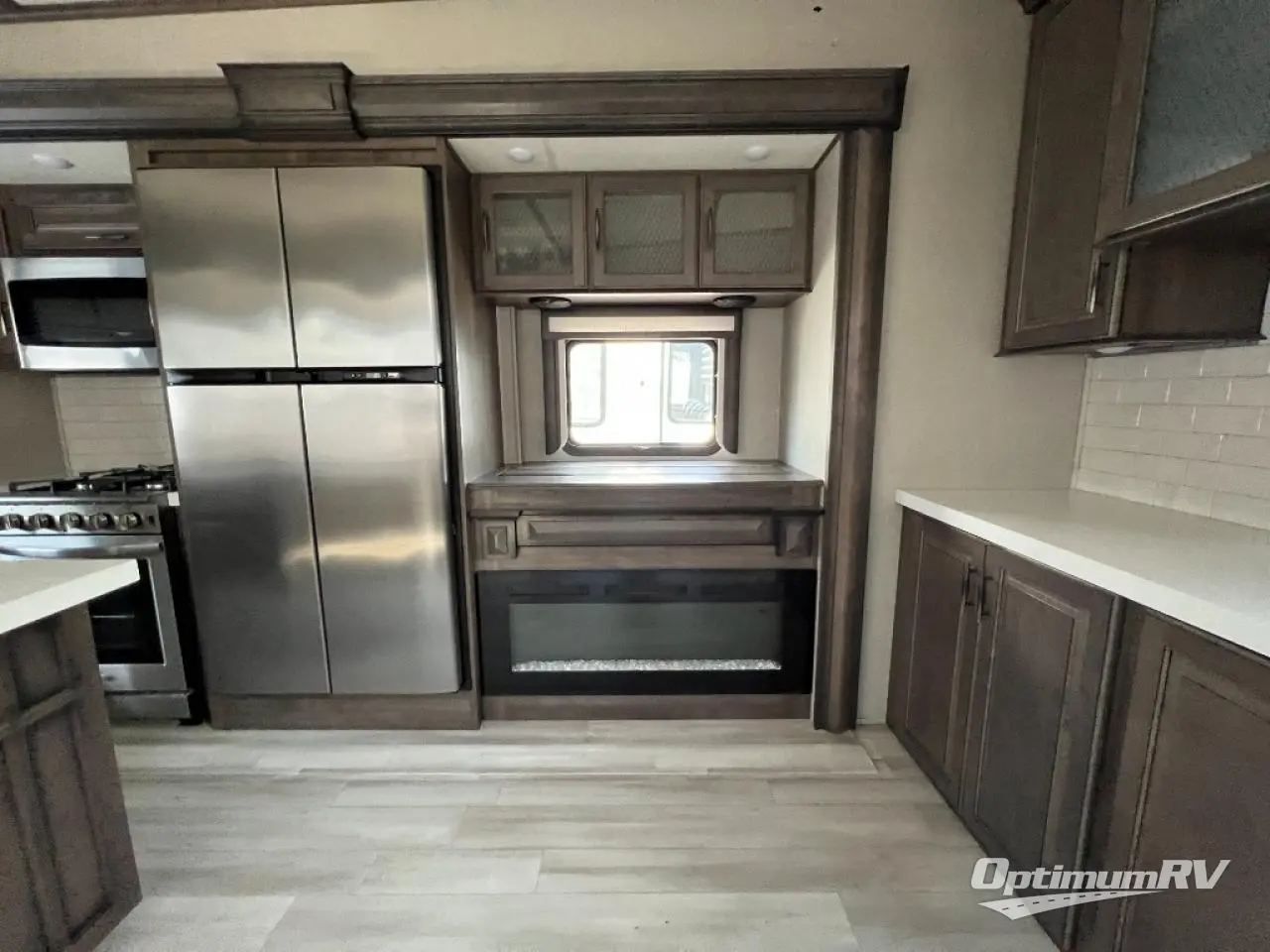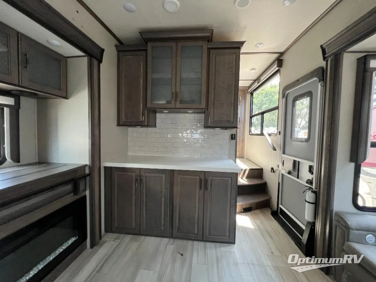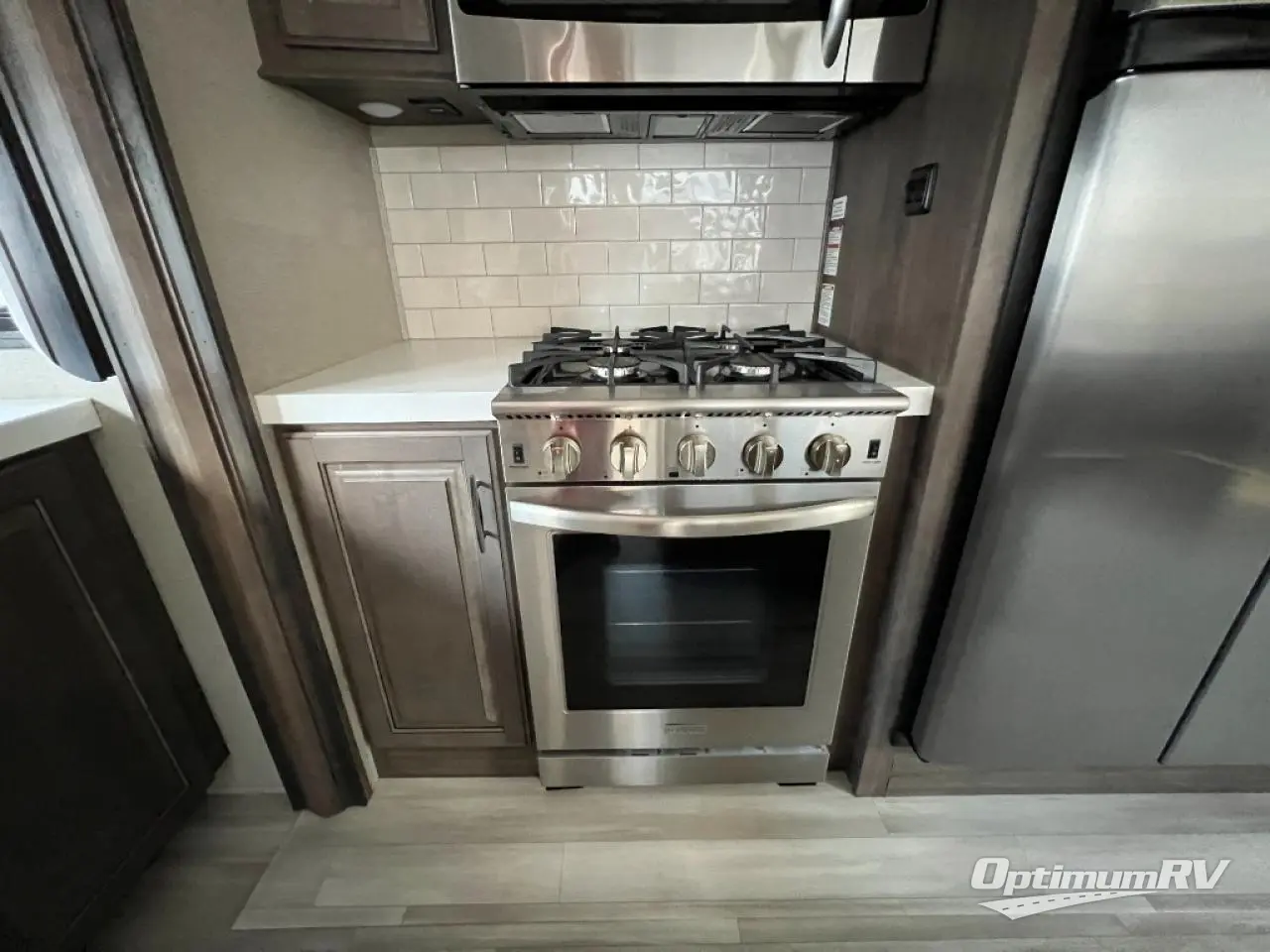 This fifth wheel offers a rear kitchen for the chef in the family to enjoy cooking while away from home! There is extra counter space along the rear wall and an oversized pantry to hold lots of goodies, plus one of the slides in this main living and kitchen area offers a professional-grade stainless steel cooktop with built-in oven, a microwave, a stainless steel residential refrigerator and a center island with a space to add a dishwasher option. The hutch/buffet give you even more counter and storage space, plus you might like to add a washer/dryer option to keep everything clean. The coat closet is near the entry for quick storage once inside, and the bathroom/bedroom slide provides more storage and the bath sink, plus more floor space in each room. You will sleep like a queen or choose the king option, and be able to watch the 32" LED TV before bedtime.