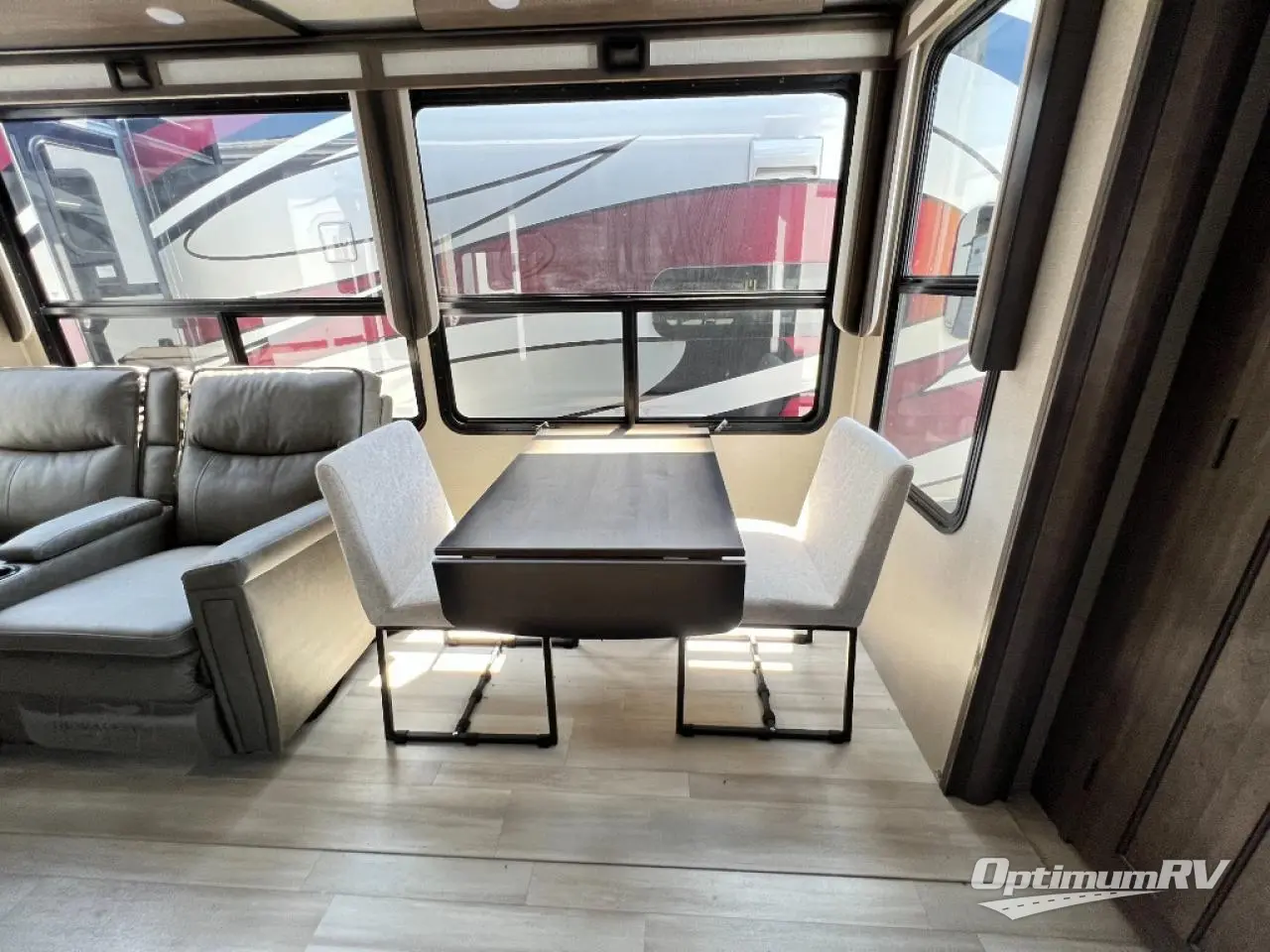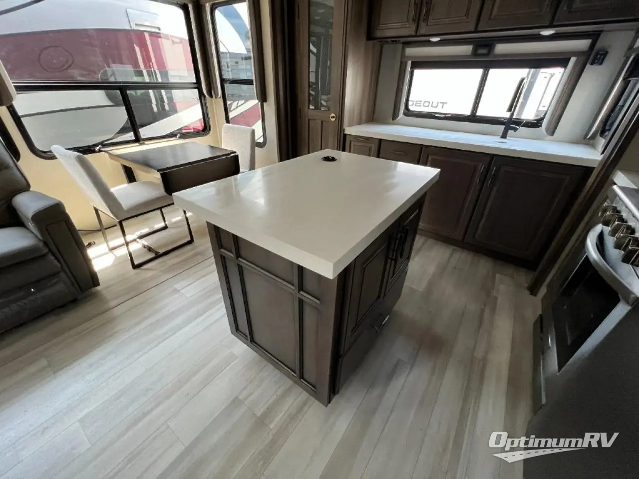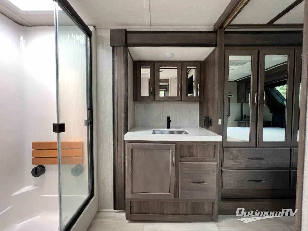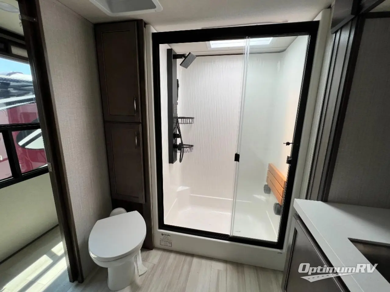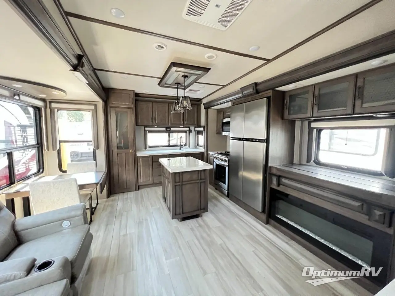 This fifth wheel offers a rear kitchen for the chef in the family to enjoy cooking while away from home! There is extra counter space along the rear wall and an oversized pantry to hold lots of goodies, plus one of the slides in this main living and kitchen area offers a professional-grade stainless steel cooktop with built-in oven, a microwave, a stainless steel residential refrigerator and a center island with a space to add a dishwasher option. The hutch/buffet give you even more counter and storage space, plus you might like to add a washer/dryer option to keep everything clean. The coat closet is near the entry for quick storage once inside, and the bathroom/bedroom slide provides more storage and the bath sink, plus more floor space in each room. You will sleep like a queen or choose the king option, and be able to watch the 32" LED TV before bedtime.