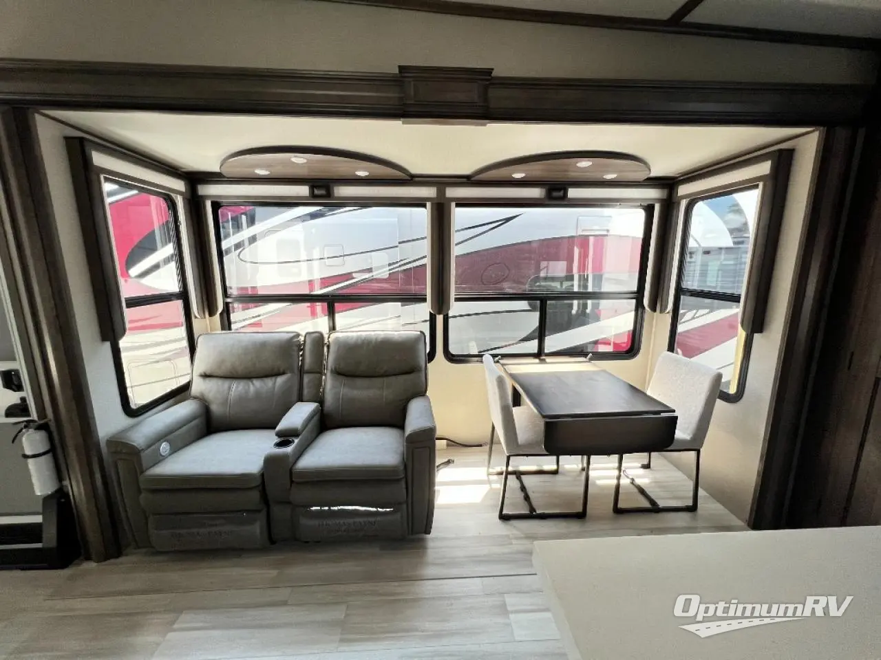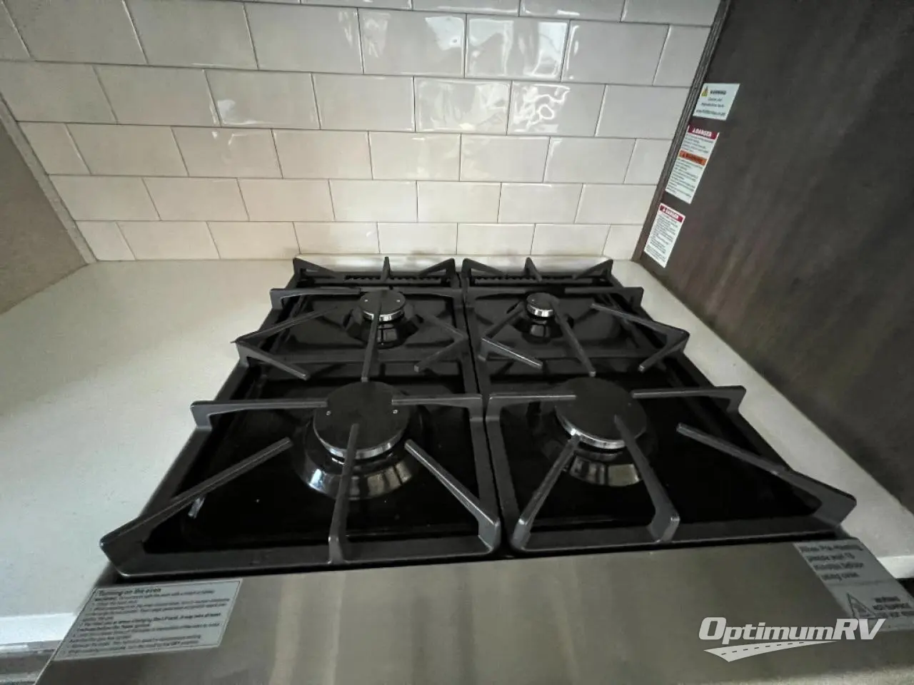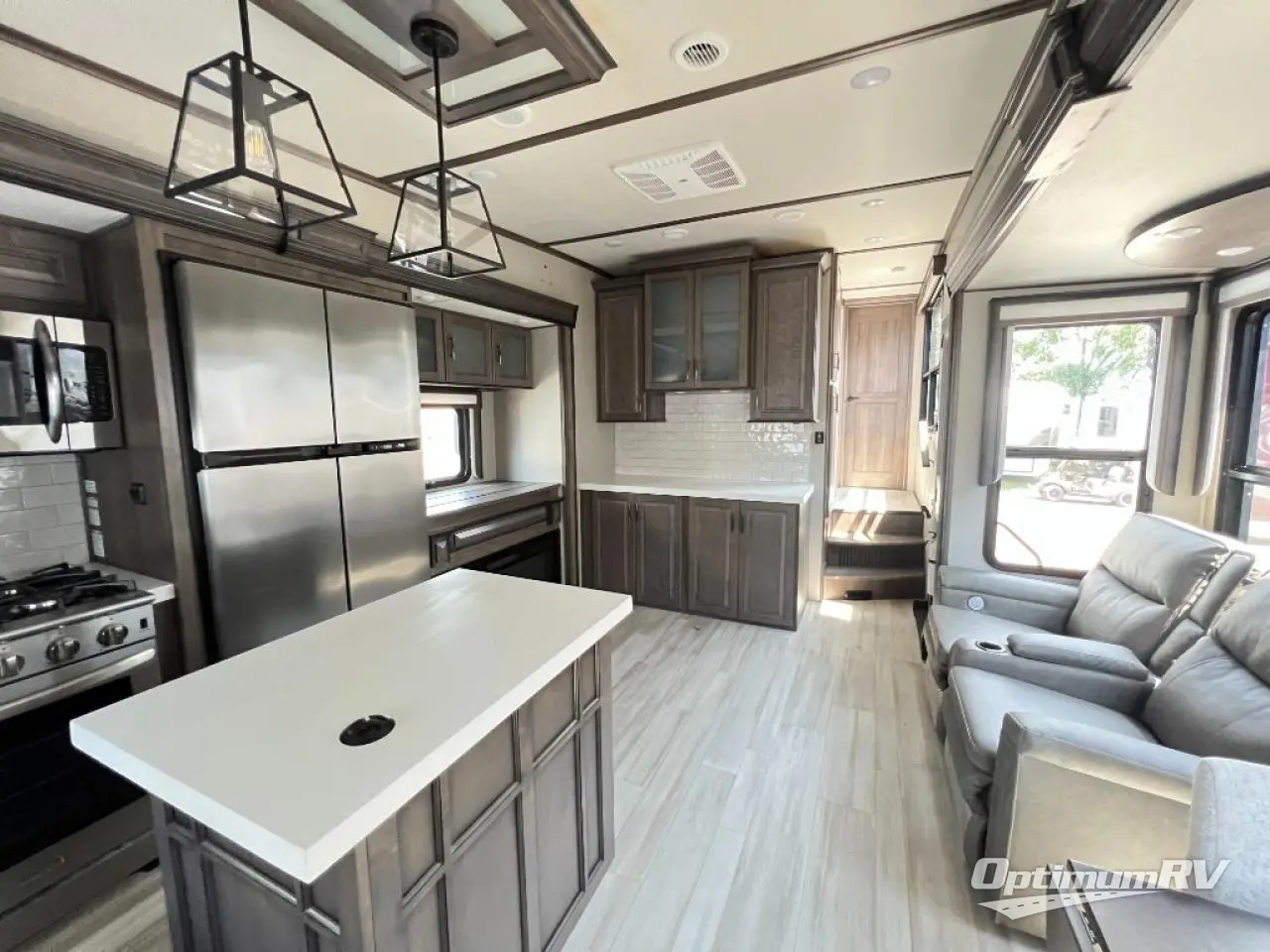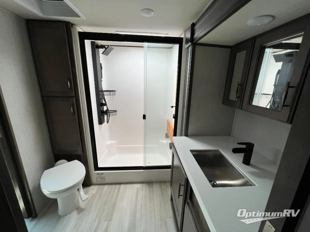 This fifth wheel offers a rear kitchen for the chef in the family to enjoy cooking while away from home! There is extra counter space along the rear wall and an oversized pantry to hold lots of goodies, plus one of the slides in this main living and kitchen area offers a professional-grade stainless steel cooktop with built-in oven, a microwave, a stainless steel residential refrigerator and a center island with a space to add a dishwasher option. The hutch/buffet give you even more counter and storage space, plus you might like to add a washer/dryer option to keep everything clean. The coat closet is near the entry for quick storage once inside, and the bathroom/bedroom slide provides more storage and the bath sink, plus more floor space in each room. You will sleep like a queen or choose the king option, and be able to watch the 32" LED TV before bedtime.