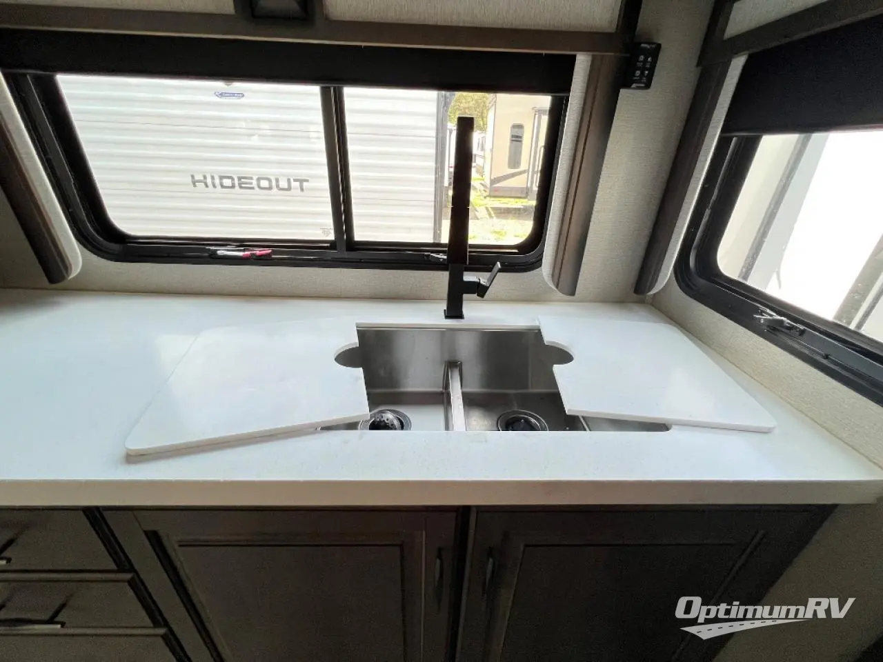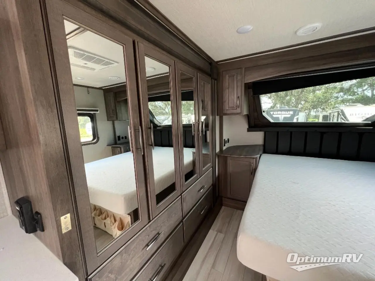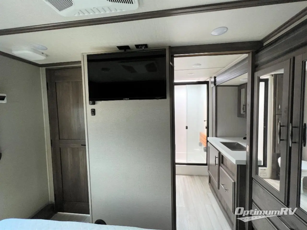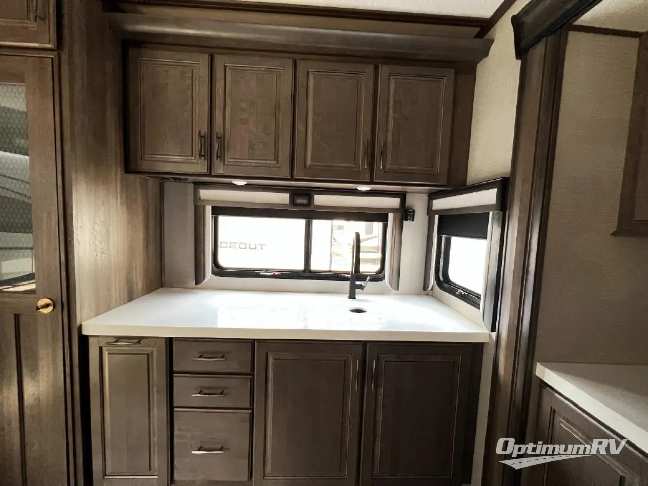 This fifth wheel offers a rear kitchen for the chef in the family to enjoy cooking while away from home! There is extra counter space along the rear wall and an oversized pantry to hold lots of goodies, plus one of the slides in this main living and kitchen area offers a professional-grade stainless steel cooktop with built-in oven, a microwave, a stainless steel residential refrigerator and a center island with a space to add a dishwasher option. The hutch/buffet give you even more counter and storage space, plus you might like to add a washer/dryer option to keep everything clean. The coat closet is near the entry for quick storage once inside, and the bathroom/bedroom slide provides more storage and the bath sink, plus more floor space in each room. You will sleep like a queen or choose the king option, and be able to watch the 32" LED TV before bedtime.