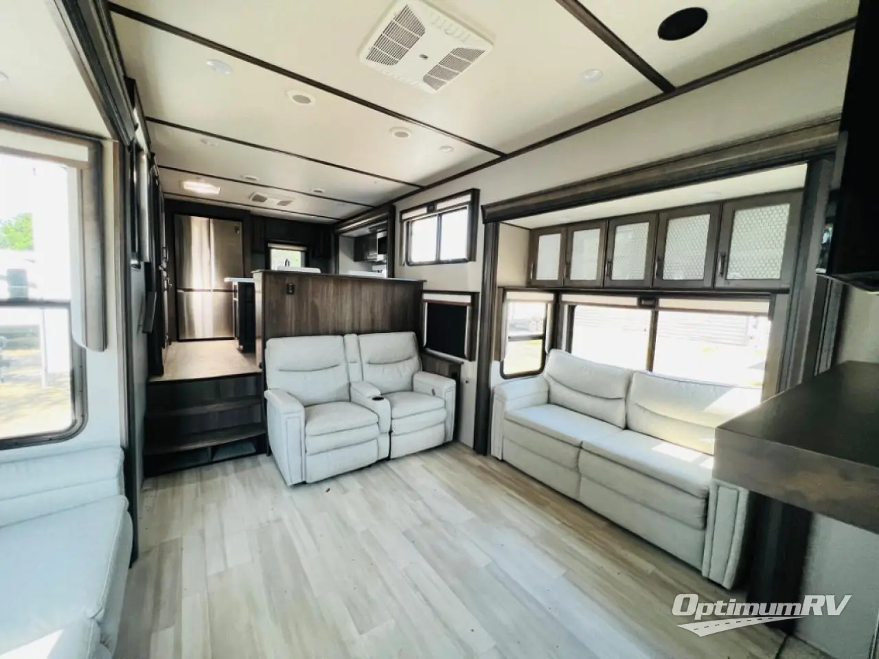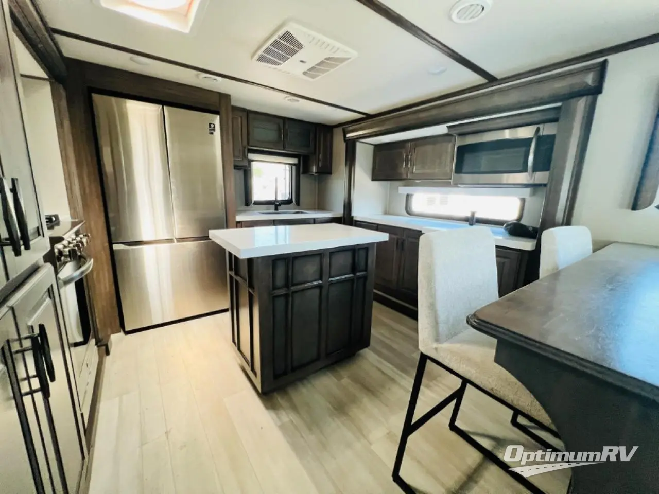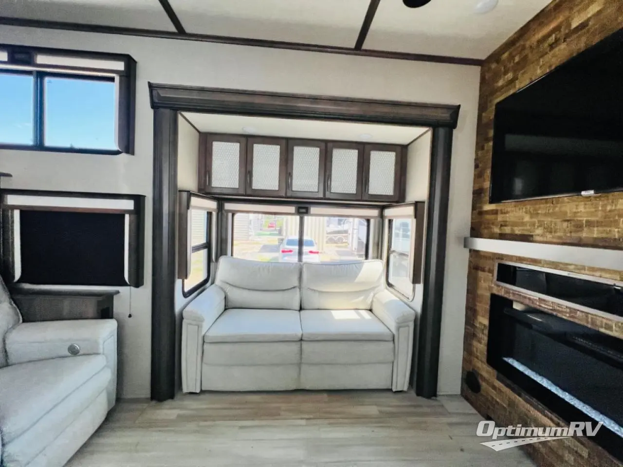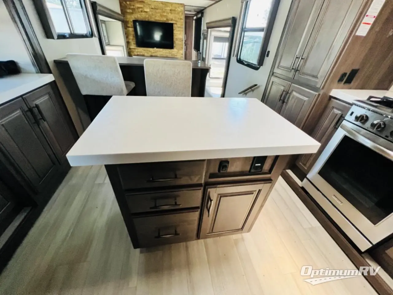 Enjoy each and every vacation, month-long trip or even extended stay at an RV park in this fifth wheel that is spacious from the front to the rear! The raised kitchen gives the cook plenty of room to whip up any type of meal using the stainless steel appliances including the 24" residential oven, the oversized pantry and the raised bar top will provide you even more counter space on top of dining with two chairs that overlook the middle living area. Relaxing is made easy with the two tri-fold sofas and theatre seating while watching the big game on the LED Smart TV and enjoying the fireplace below. Dual sinks in the full bathroom allow two people to easily get ready at once, and the seat in the shower is a nice convenience. At night, retire to your own queen bed slide after sitting on the pull-out ottoman to take your shoes off, and enjoy a show on the LED TV above the flip-top dresser, or wash some linens in the closet with a washer/dryer if you added that option.