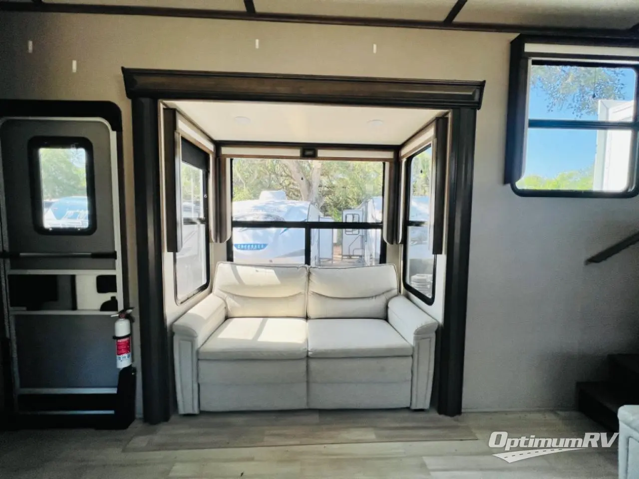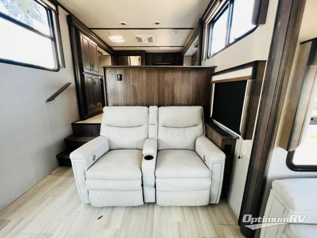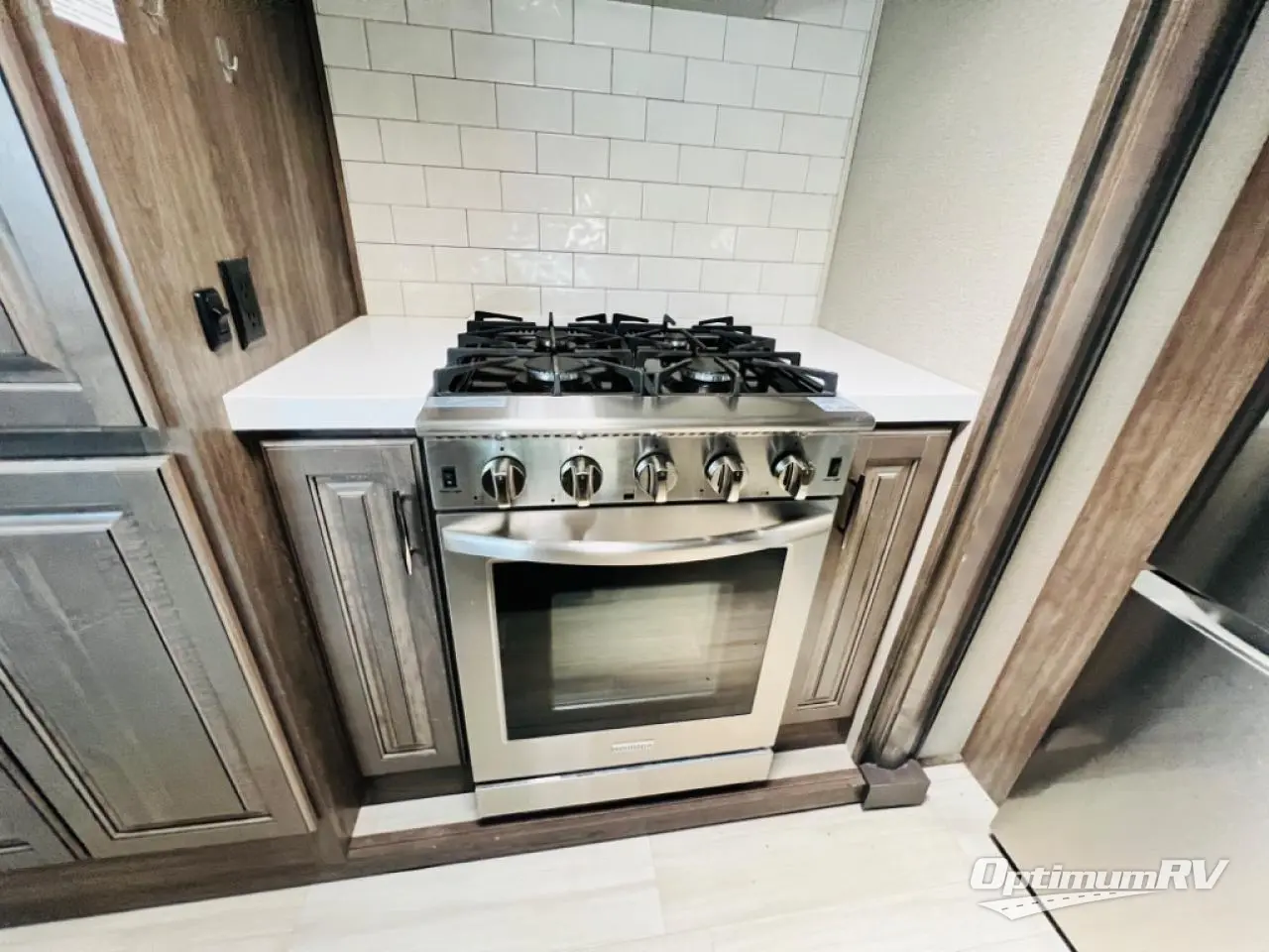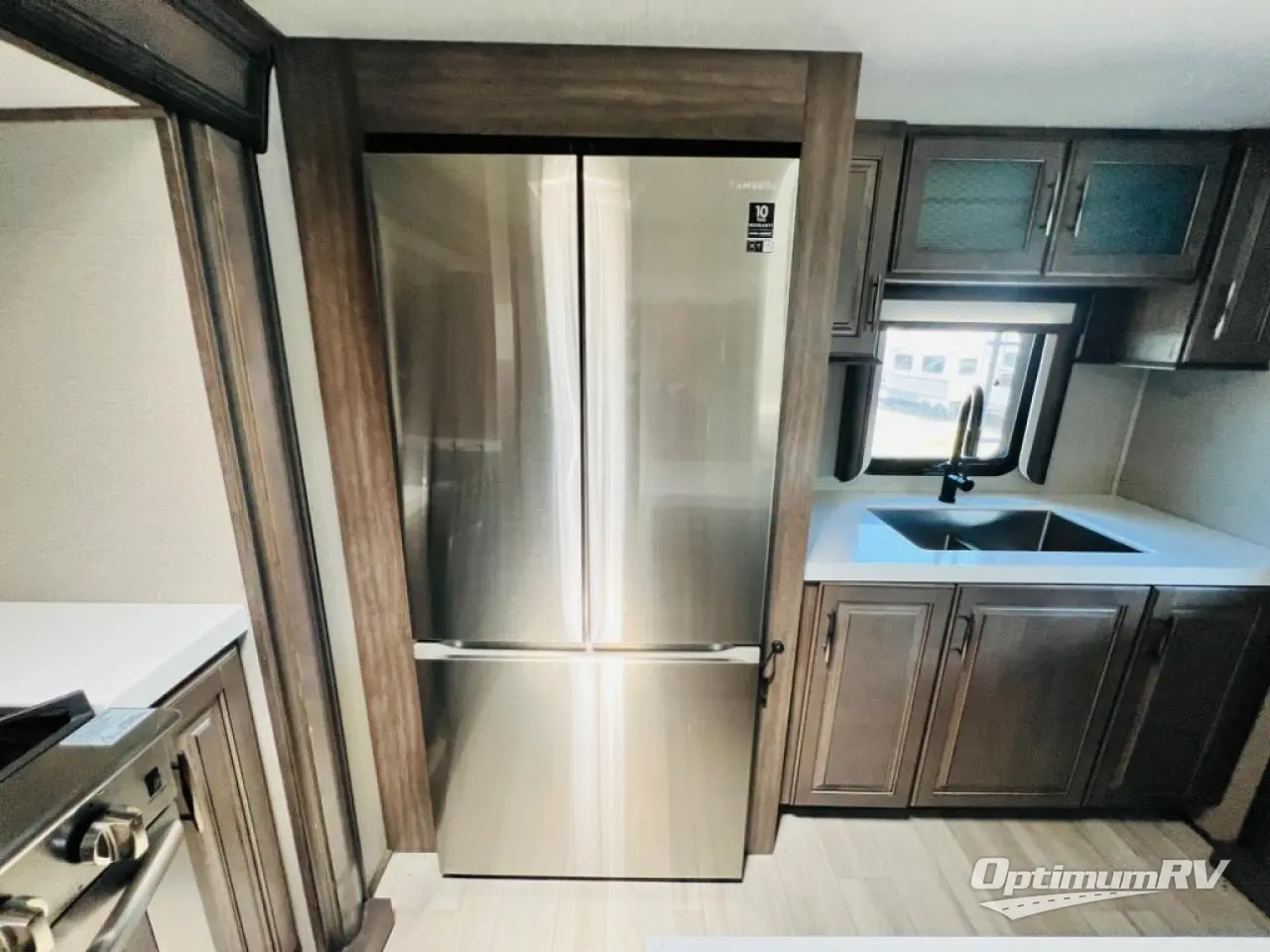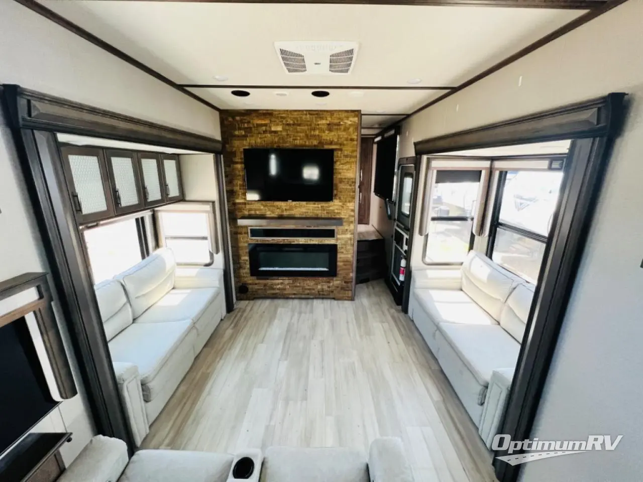 Enjoy each and every vacation, month-long trip or even extended stay at an RV park in this fifth wheel that is spacious from the front to the rear! The raised kitchen gives the cook plenty of room to whip up any type of meal using the stainless steel appliances including the 24" residential oven, the oversized pantry and the raised bar top will provide you even more counter space on top of dining with two chairs that overlook the middle living area. Relaxing is made easy with the two tri-fold sofas and theatre seating while watching the big game on the LED Smart TV and enjoying the fireplace below. Dual sinks in the full bathroom allow two people to easily get ready at once, and the seat in the shower is a nice convenience. At night, retire to your own queen bed slide after sitting on the pull-out ottoman to take your shoes off, and enjoy a show on the LED TV above the flip-top dresser, or wash some linens in the closet with a washer/dryer if you added that option.