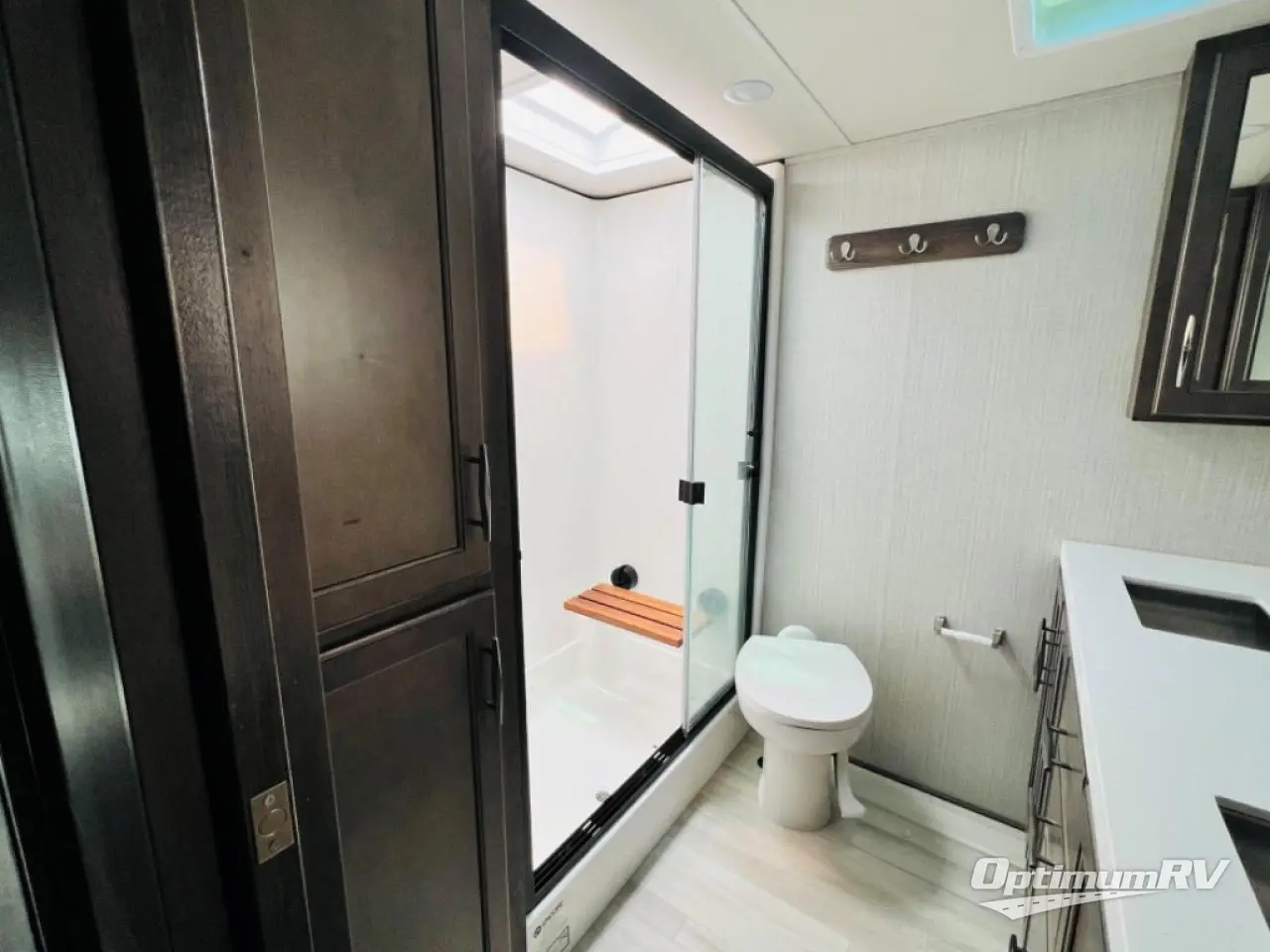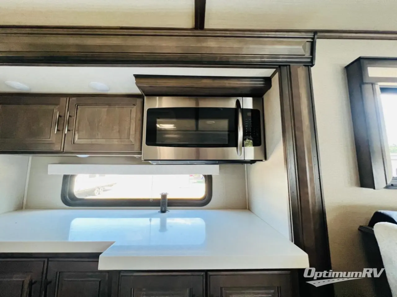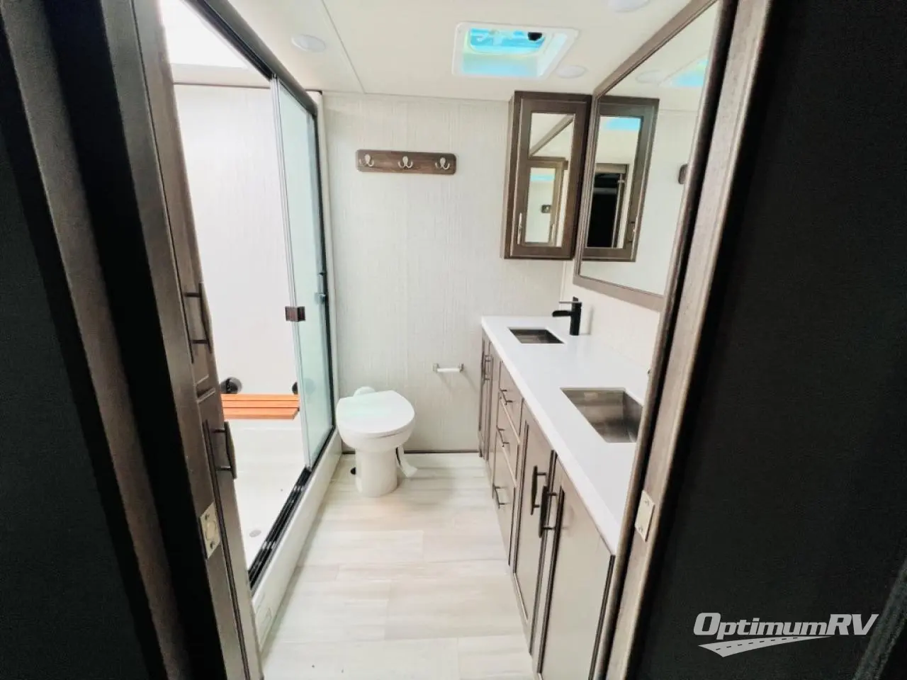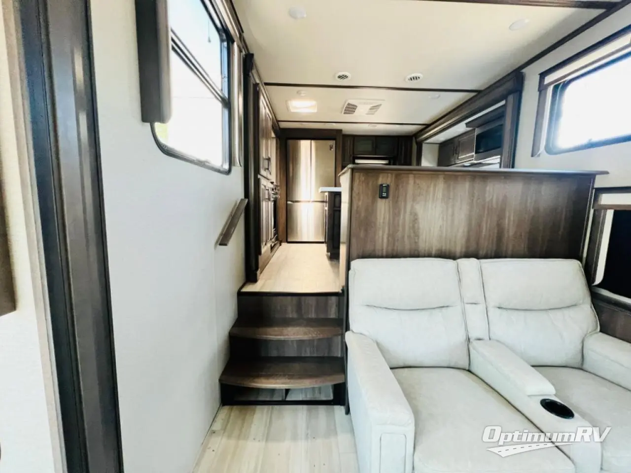 Enjoy each and every vacation, month-long trip or even extended stay at an RV park in this fifth wheel that is spacious from the front to the rear! The raised kitchen gives the cook plenty of room to whip up any type of meal using the stainless steel appliances including the 24" residential oven, the oversized pantry and the raised bar top will provide you even more counter space on top of dining with two chairs that overlook the middle living area. Relaxing is made easy with the two tri-fold sofas and theatre seating while watching the big game on the LED Smart TV and enjoying the fireplace below. Dual sinks in the full bathroom allow two people to easily get ready at once, and the seat in the shower is a nice convenience. At night, retire to your own queen bed slide after sitting on the pull-out ottoman to take your shoes off, and enjoy a show on the LED TV above the flip-top dresser, or wash some linens in the closet with a washer/dryer if you added that option.
