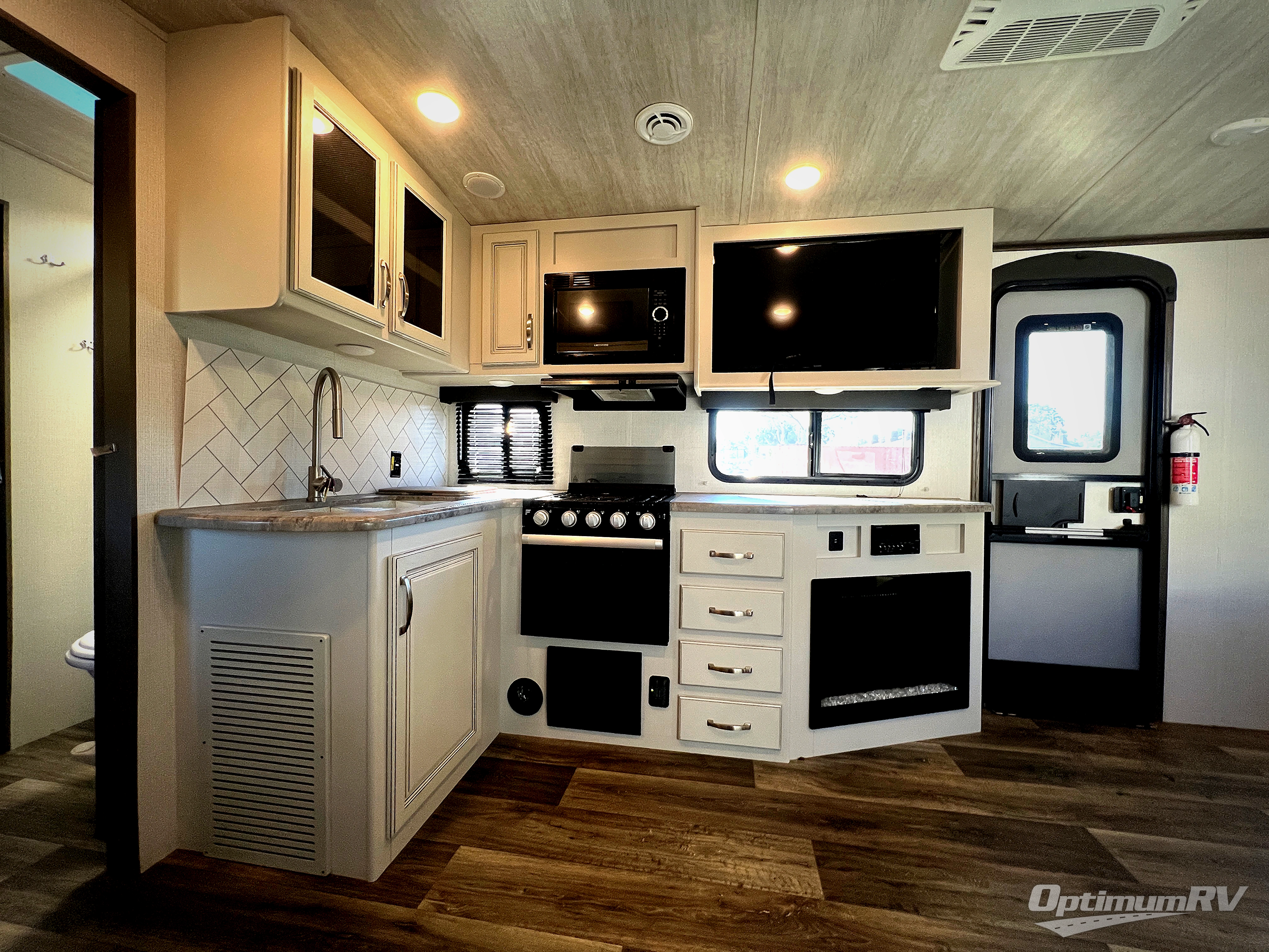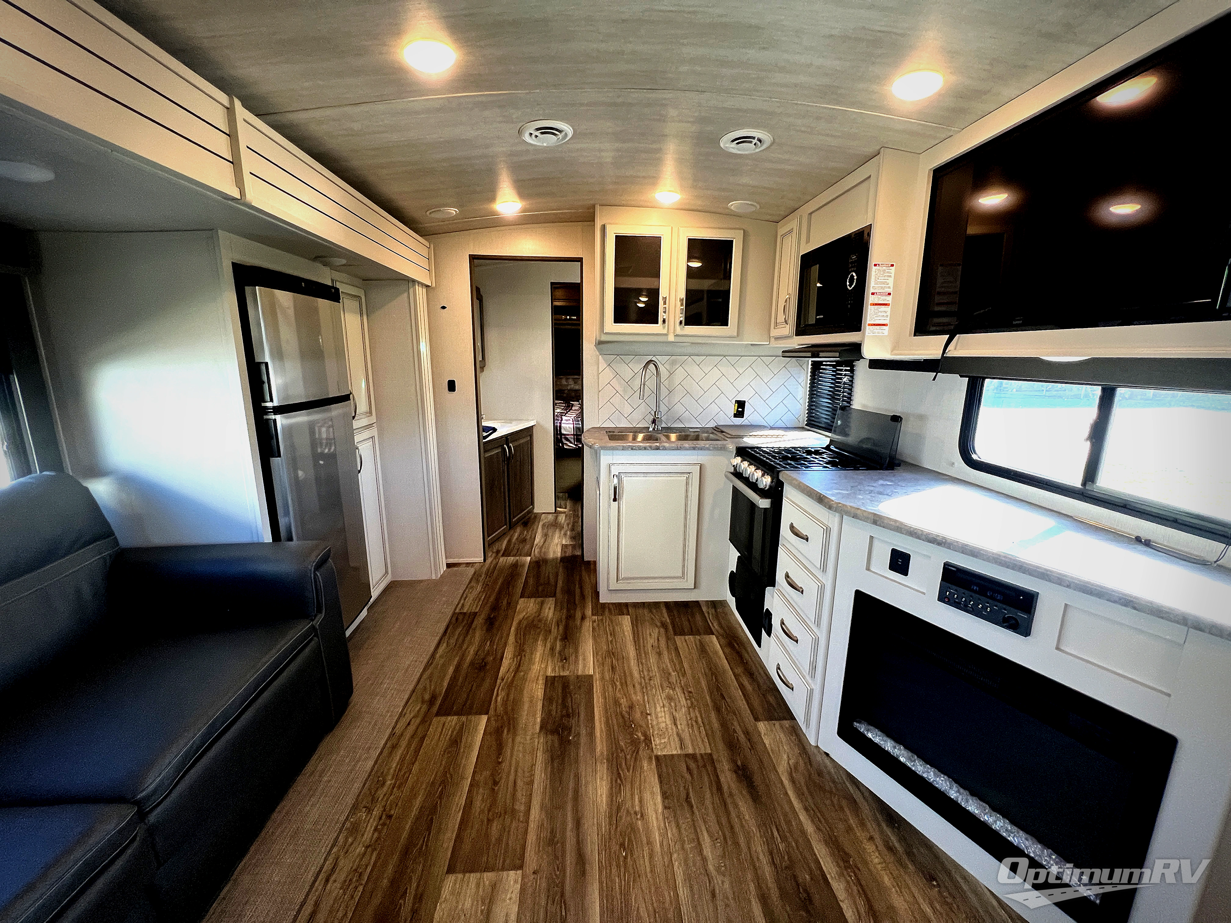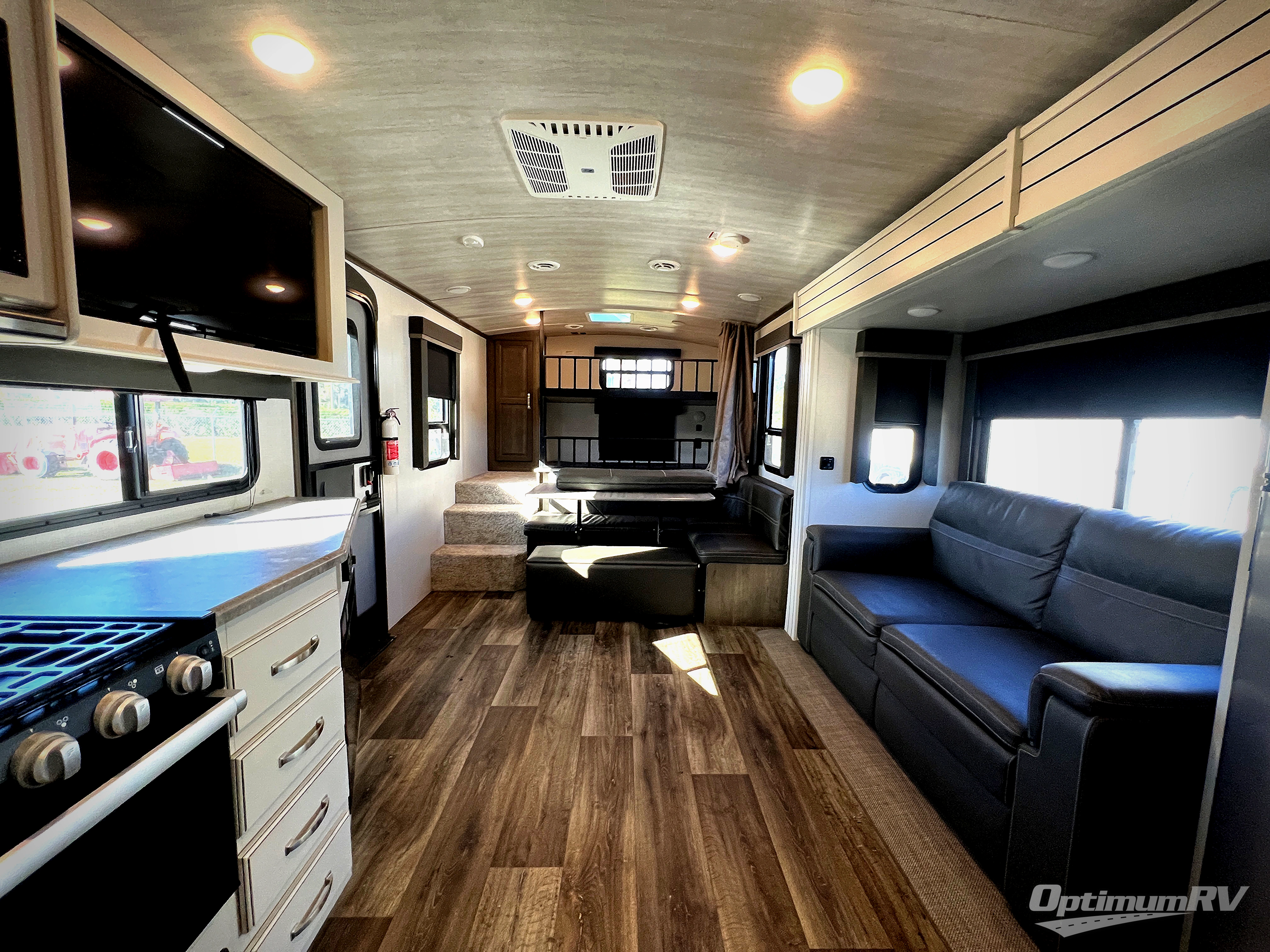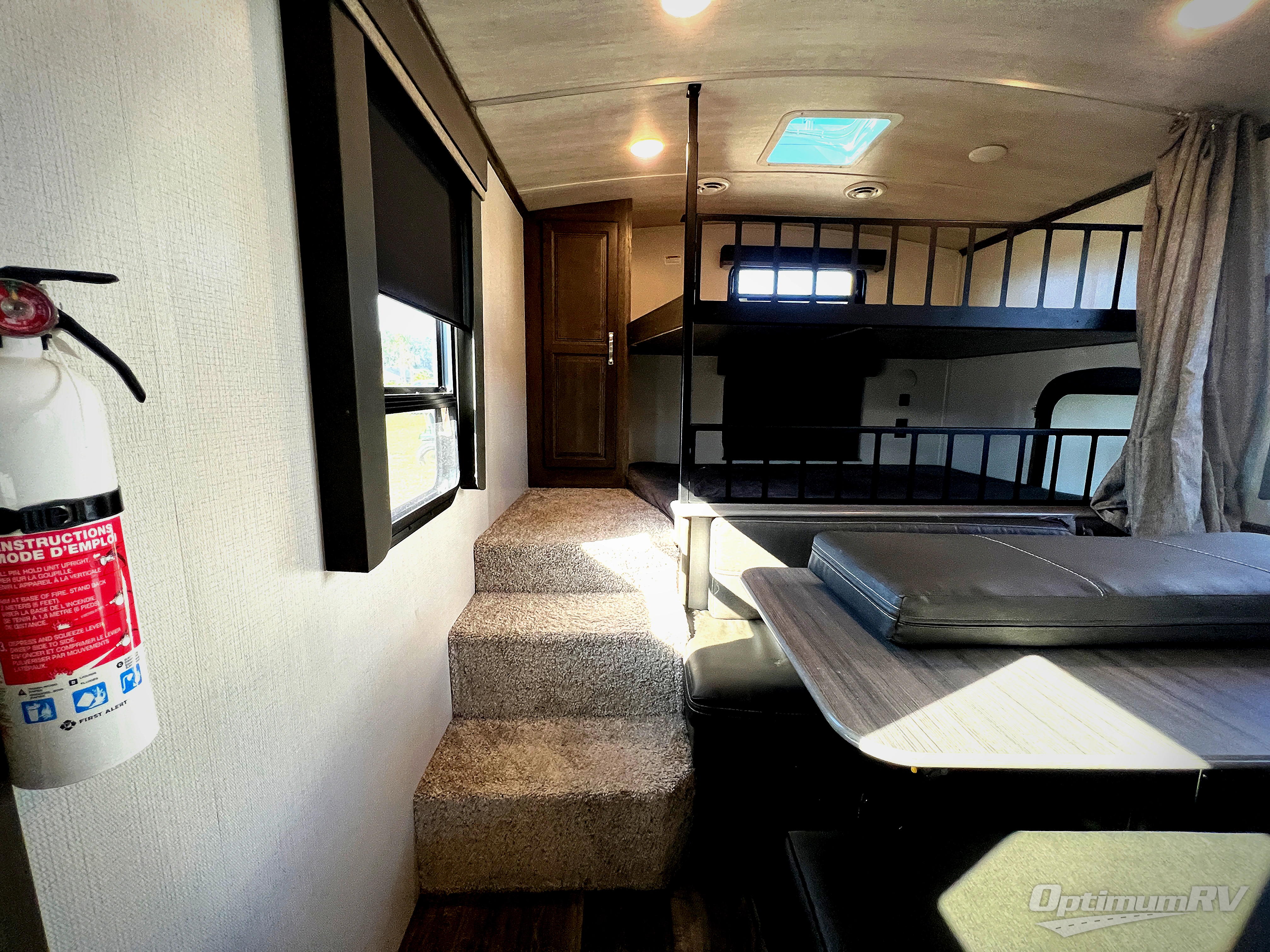 You're going to love camping with friends or family in this spacious travel trailer. There are double-size bunks in the back, and the lower bunk flips up for storage of luggage, camp gear, or toys. The group can relax in the main living area that includes a tri-fold sleeper sofa within the large slide out, plus there is an L-shaped booth dinette with an ottoman/bench seat for a unique set-up. There is even a fireplace and an LED HDTV for those rainy days you stay indoors. This model includes all the appliances indoors needed to prepare meals each day, plus there is a capital grill outdoors and an exterior mini fridge for cold drinks. And check out the 19' power awning that will shade you as you cook up lunch!