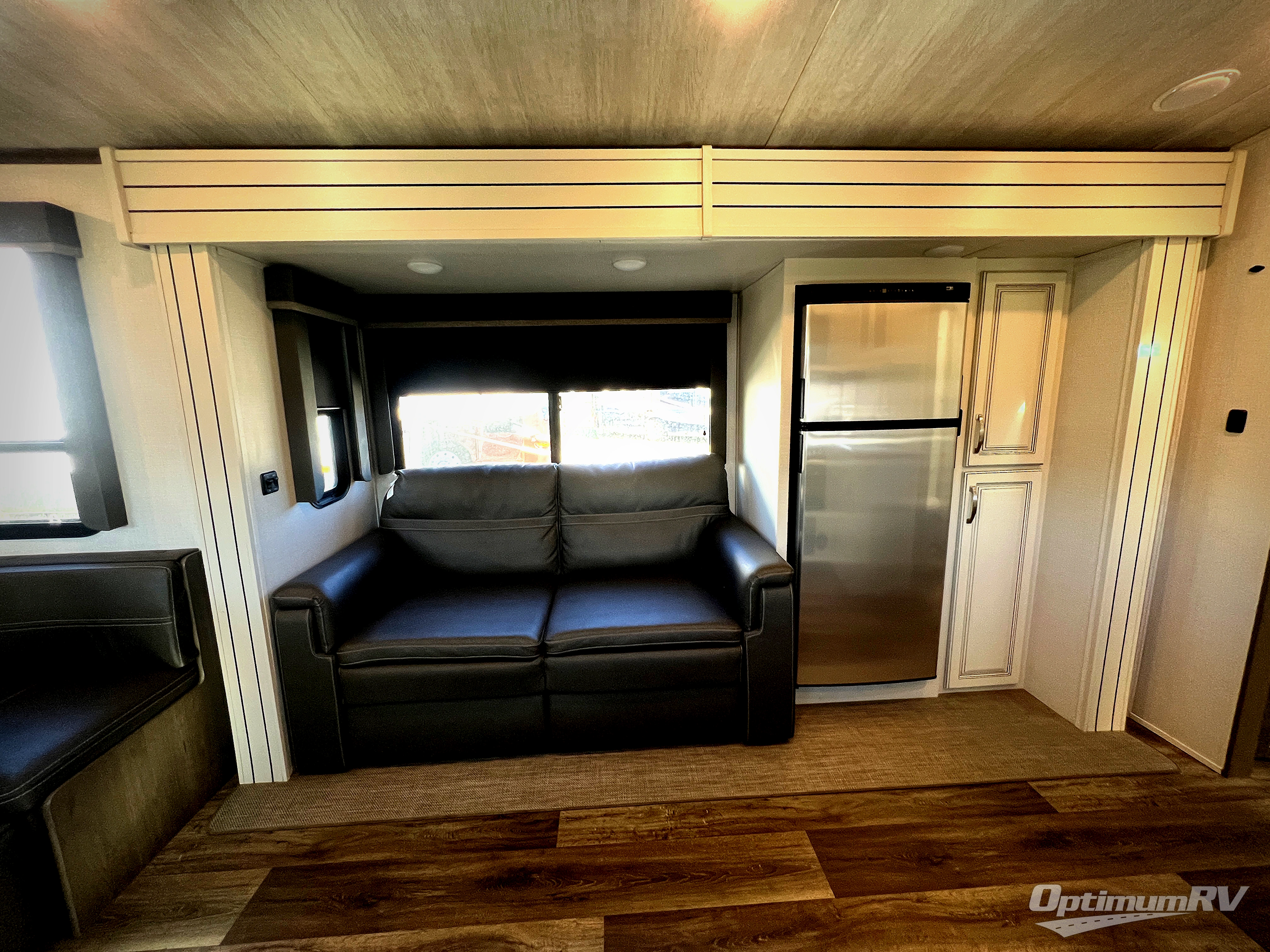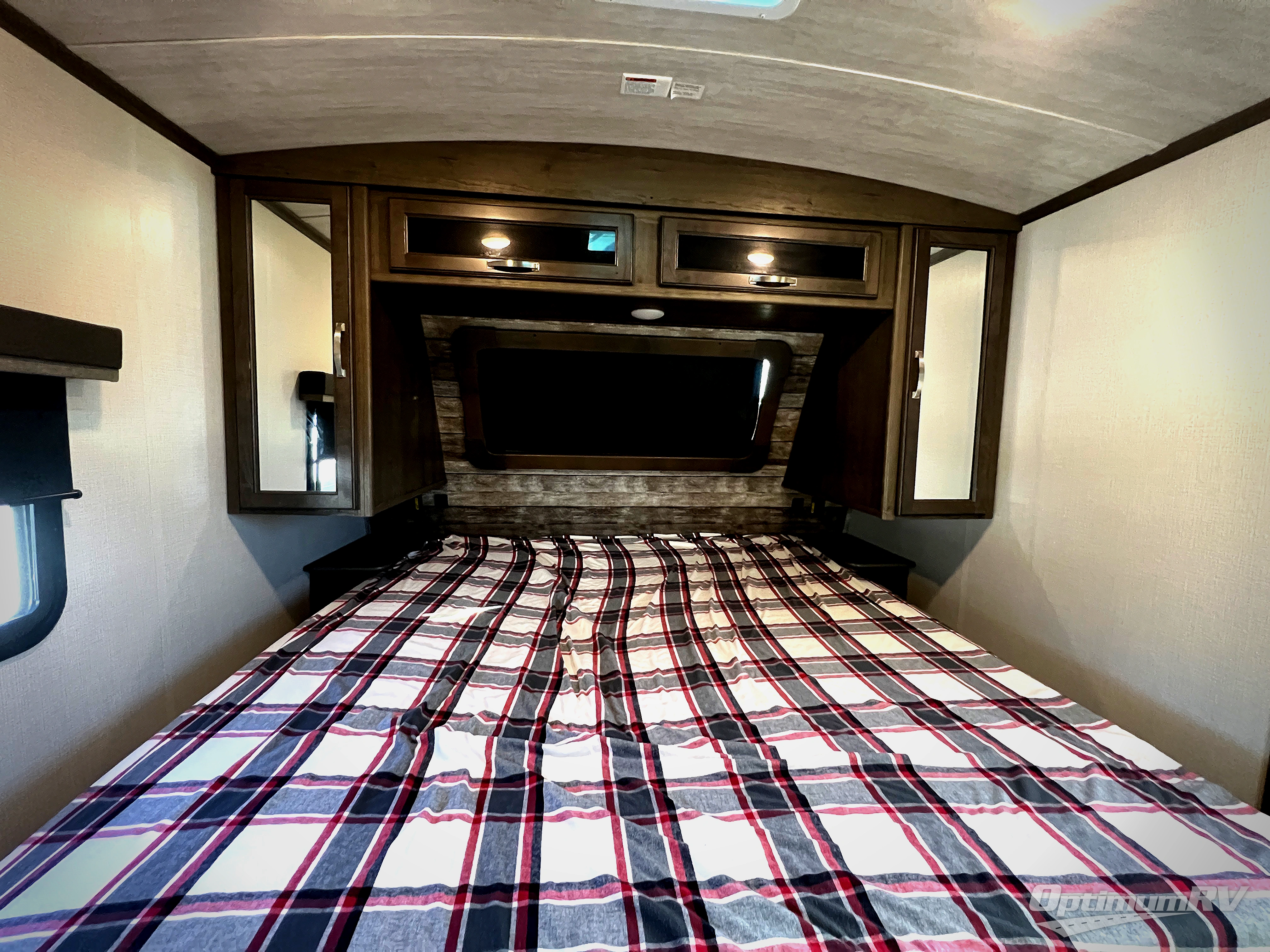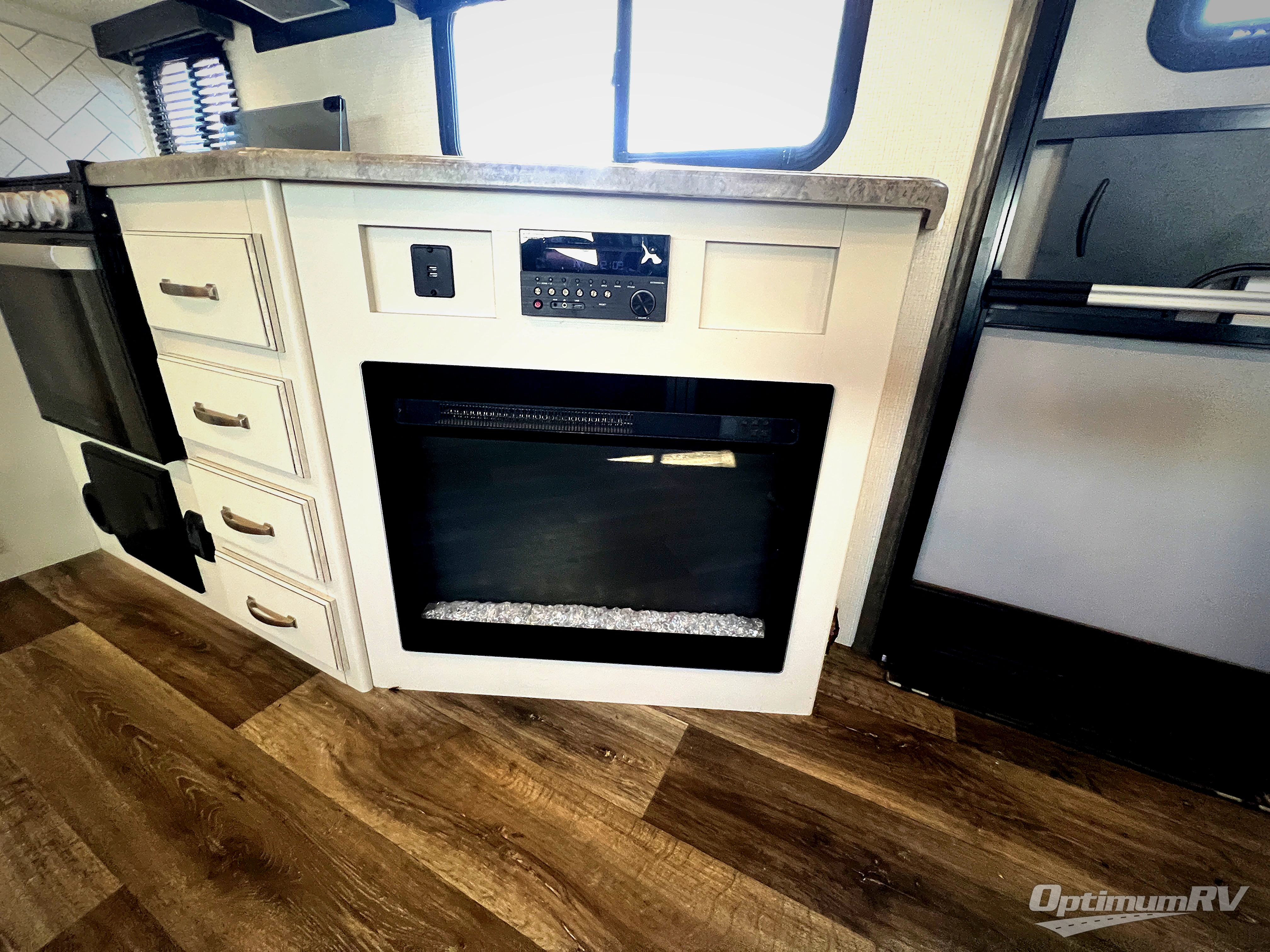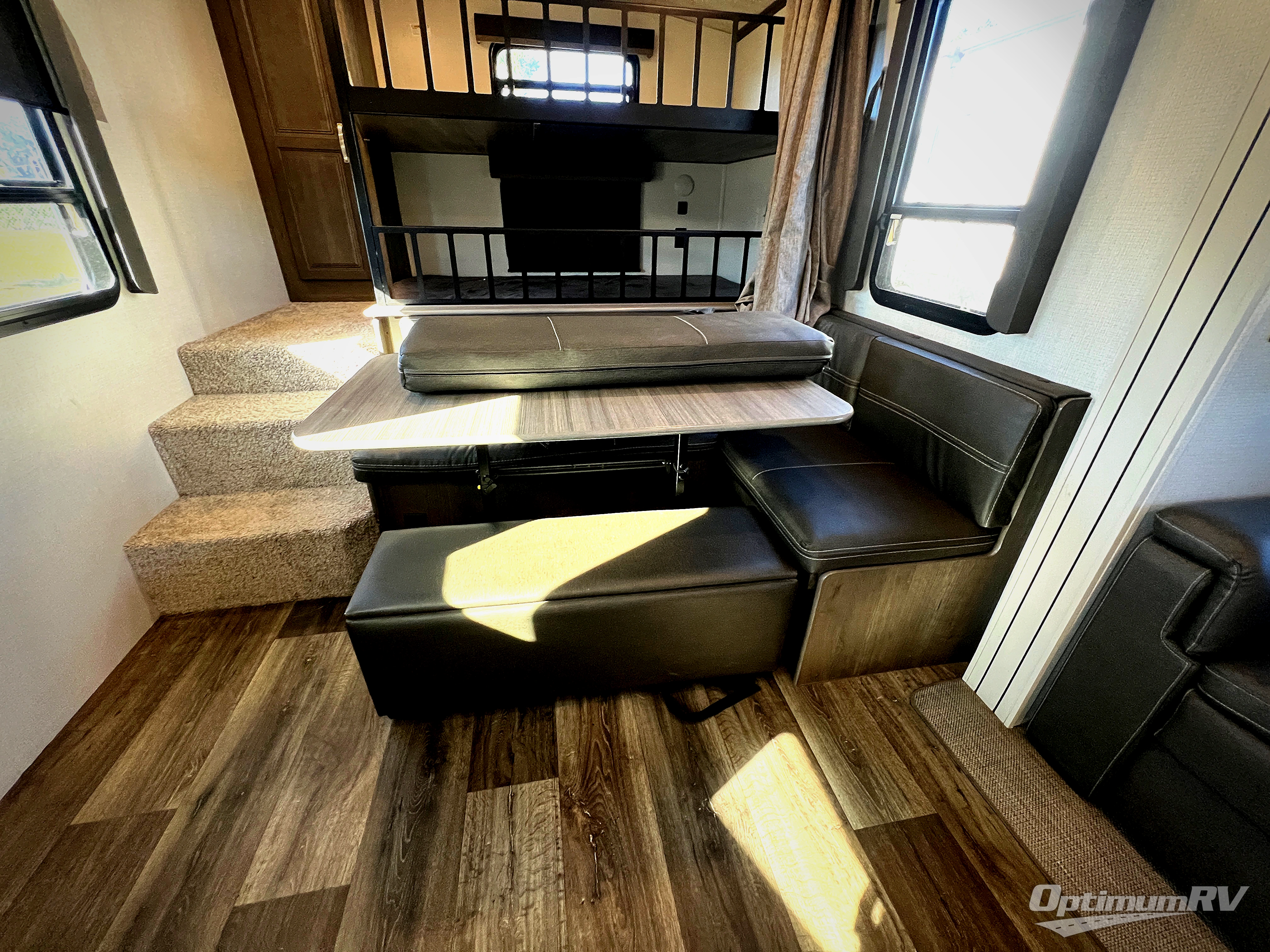 You're going to love camping with friends or family in this spacious travel trailer. There are double-size bunks in the back, and the lower bunk flips up for storage of luggage, camp gear, or toys. The group can relax in the main living area that includes a tri-fold sleeper sofa within the large slide out, plus there is an L-shaped booth dinette with an ottoman/bench seat for a unique set-up. There is even a fireplace and an LED HDTV for those rainy days you stay indoors. This model includes all the appliances indoors needed to prepare meals each day, plus there is a capital grill outdoors and an exterior mini fridge for cold drinks. And check out the 19' power awning that will shade you as you cook up lunch!