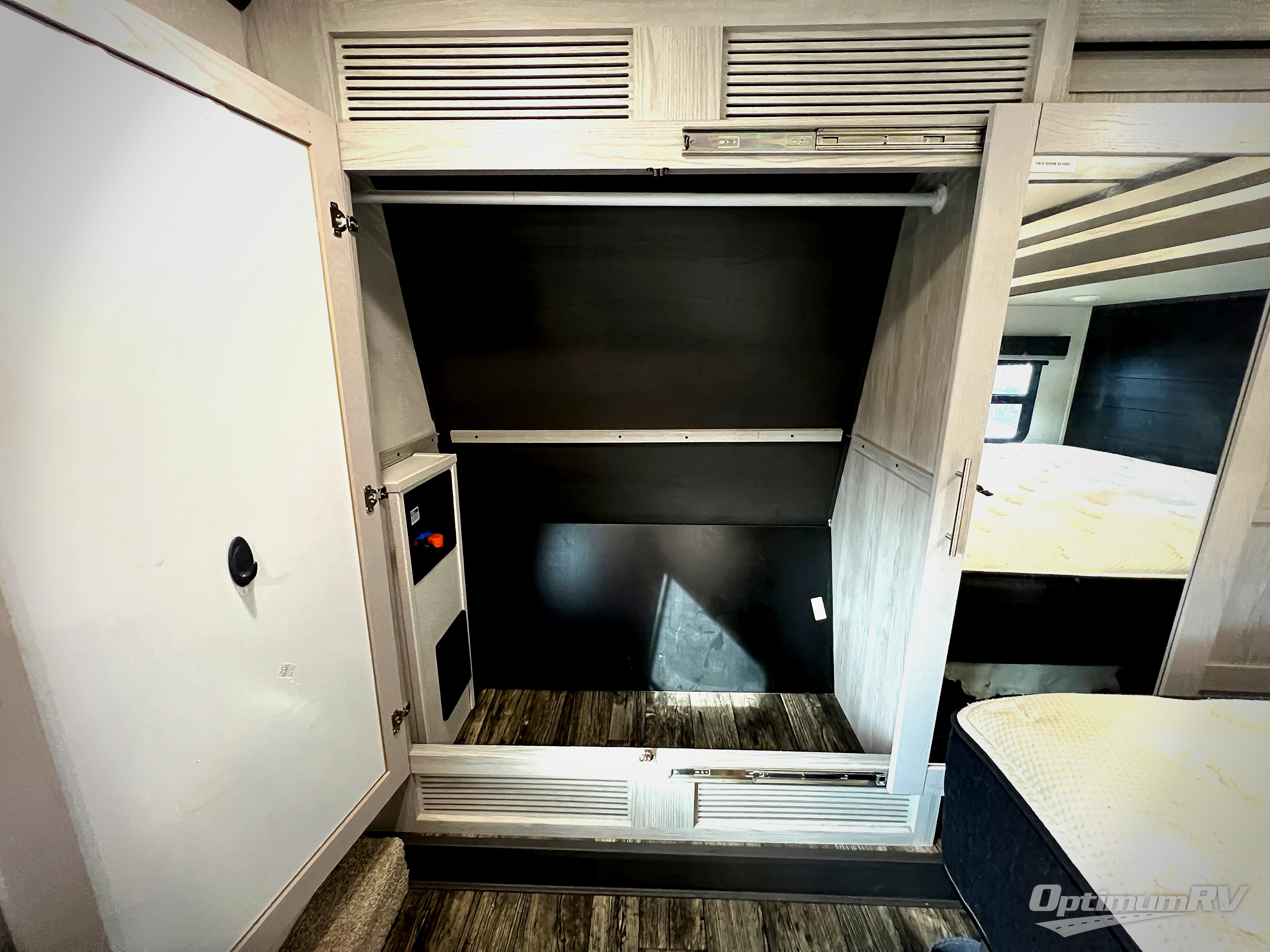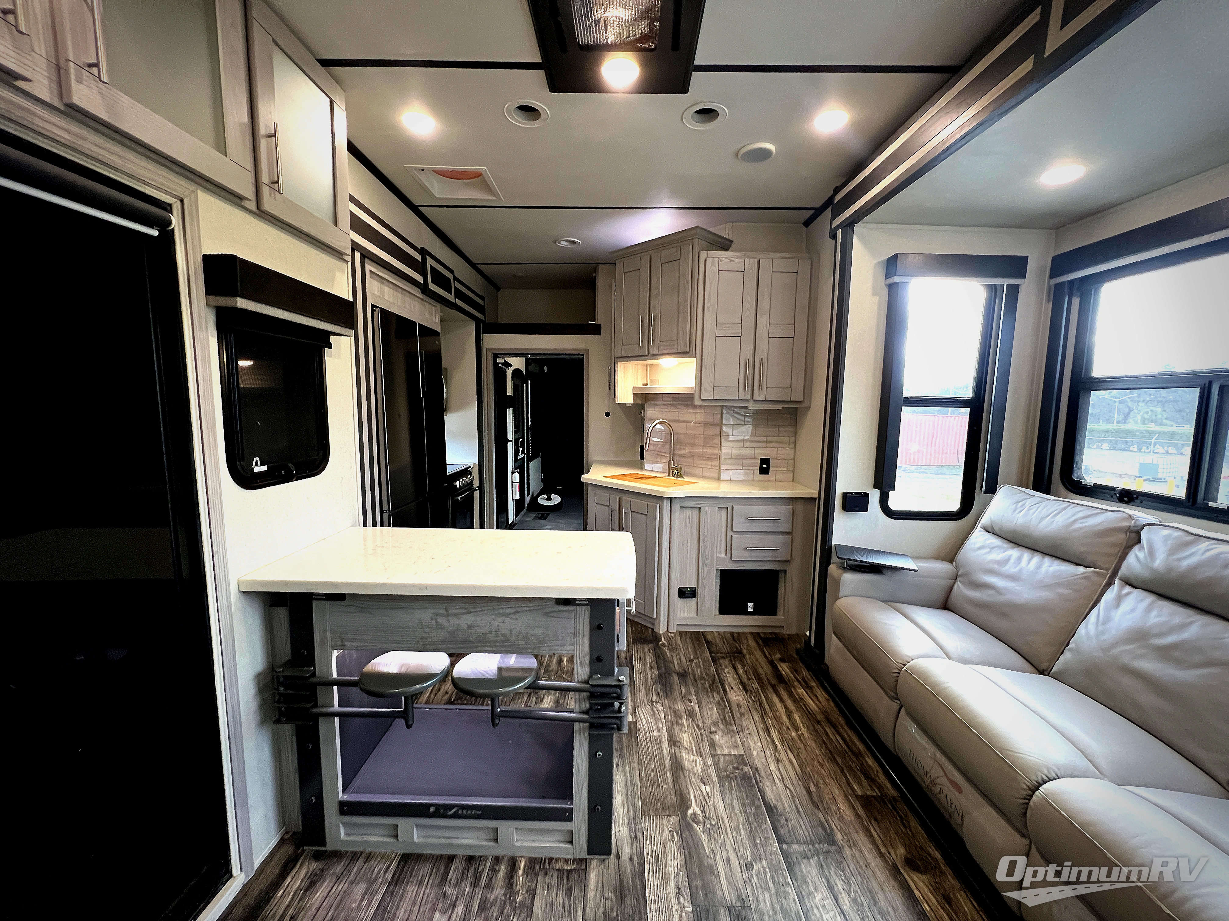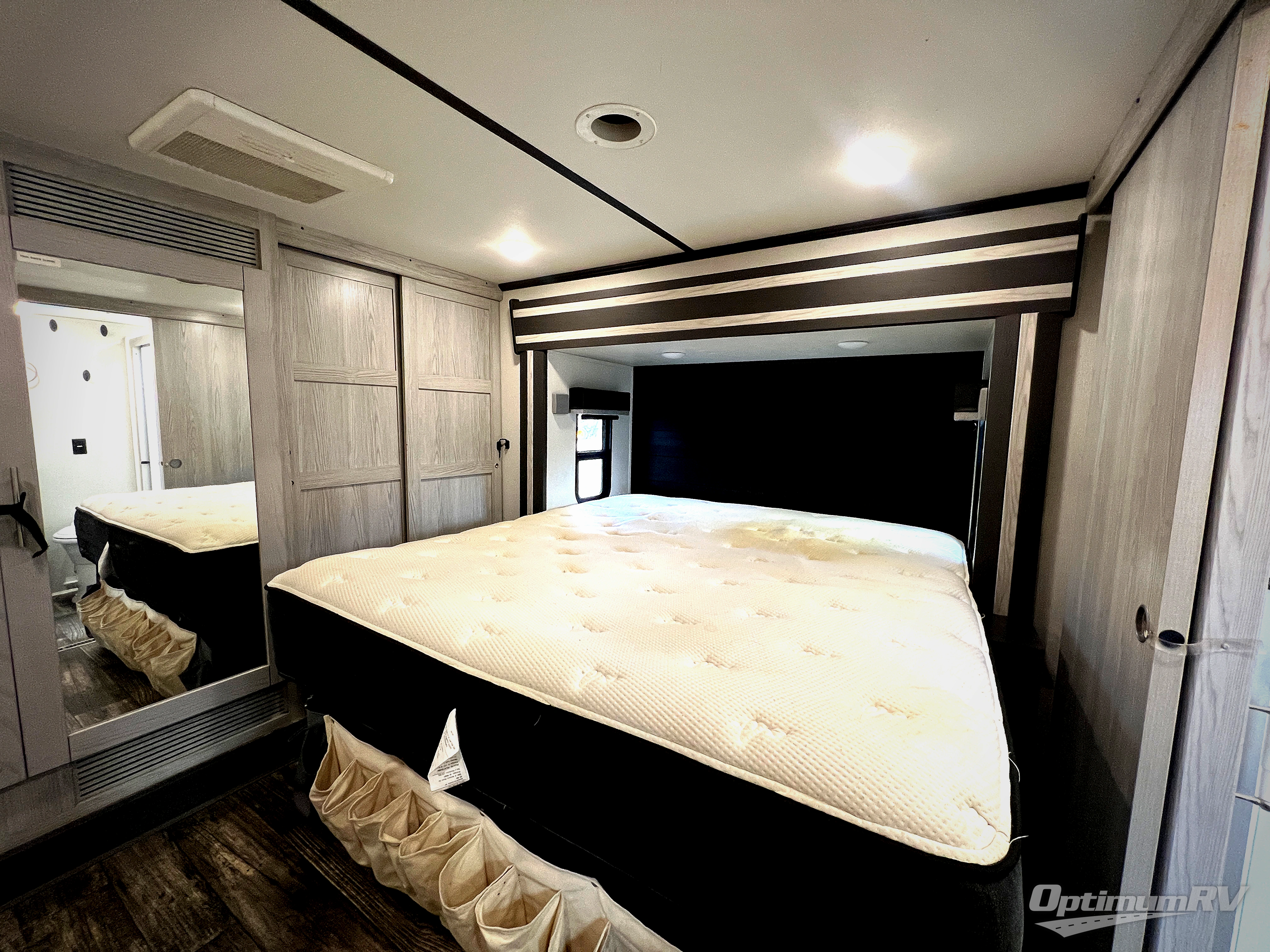 You're going to be the talk of the campground with a side patio on this toy hauler! As you walk-through the patio entry door, you will notice a table with swing-out stools to your left and a swiveling entertainment center with an LED TV, a fireplace, and a hidden pantry to your right, plus a residential four person sofa with heat, massage, and 110V/USB ports to charge your electronics. You will enjoy your own privacy with the front private bedroom which has a residential queen bed slide, a dresser with an LED TV, and a front master closet prepped to add an optional washer and dryer, plus an entrance into the dual entry bathroom. The rest of your gang will enjoy a good night's rest in the 13' garage area with dual opposing sofas with a queen bed above them and a loft with bunk mat. The garage also has a half bathroom for their convenience, an LED TV for entertainment, and a 8' MORryde zero gravity ramp door to easily load an unload your toys!