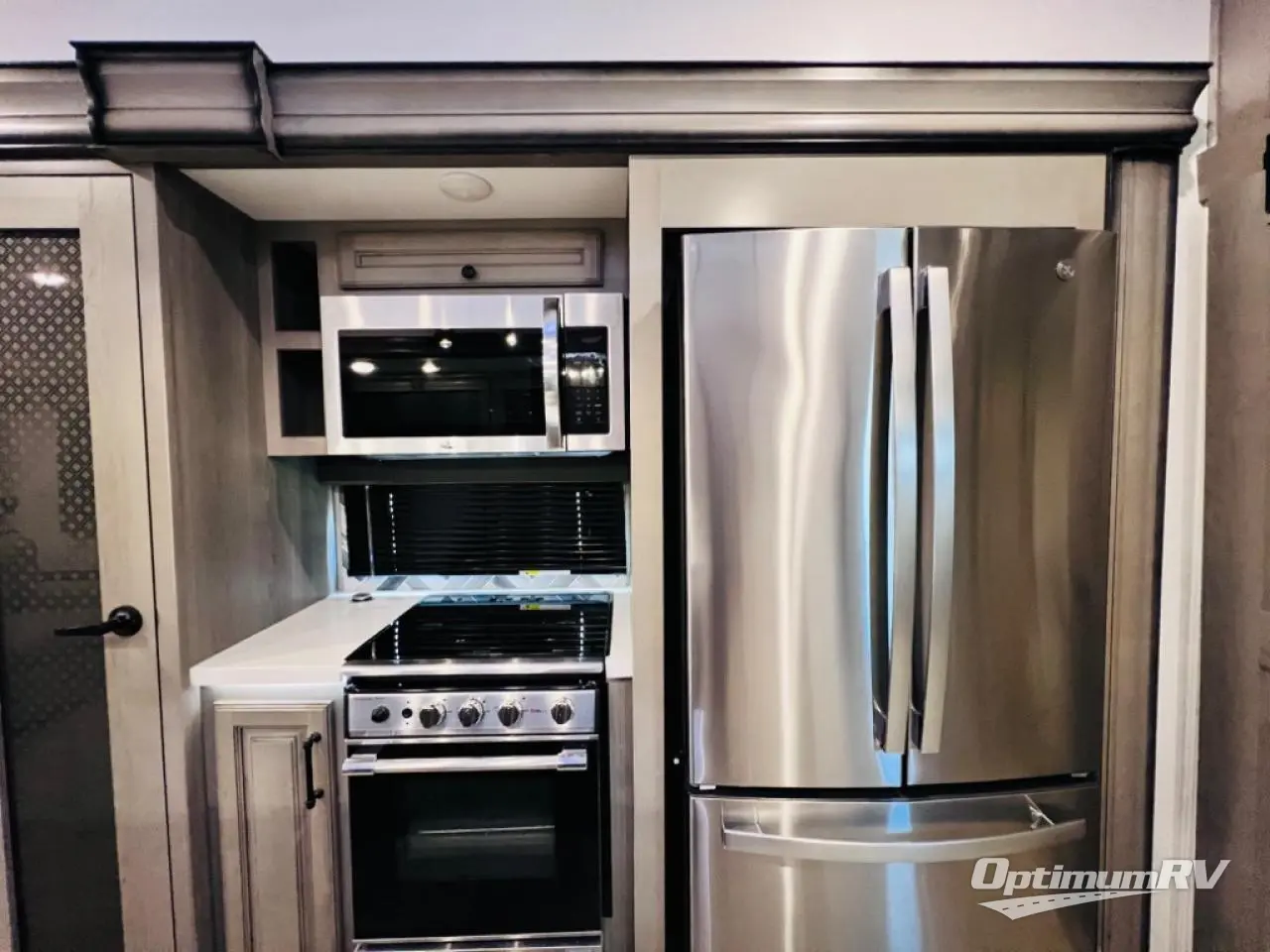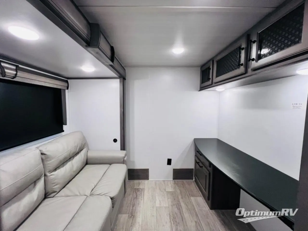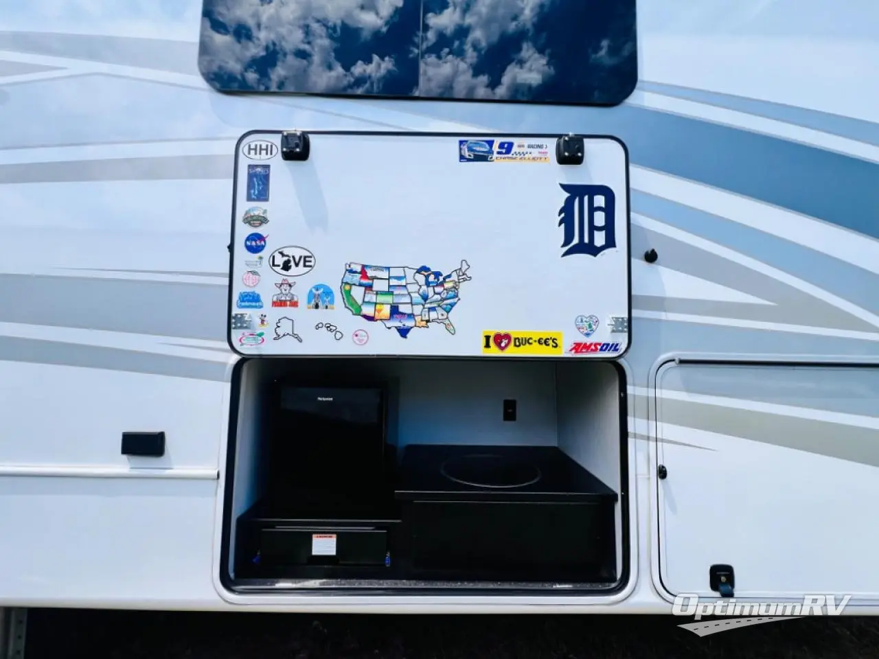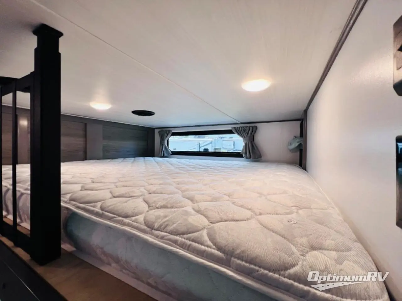 Everyone will have a comfortable place to sleep with two bedrooms in this fifth wheel! The front private bedroom has a king bed slide with storage underneath, a dresser with a 32" LCD HDTV, and a large front closet with a clothing hamper and an area prepped to add the optional stackable washer and dryer. The bonus room has a hide-a-bed sofa across from a desk so you can get some work done while you're away, plus a loft area/attic space above it all with a ladder to access it. The full bathroom has a 48" x 30" fiberglass shower with a seat and skylight above and a linen closet to keep your towels close. The chef can prepare delicious home cooked meals for everyone either indoors with the glass top range or at the outdoor kitchen with a two burner cooktop and refrigerator to keep your drink nice and cold!