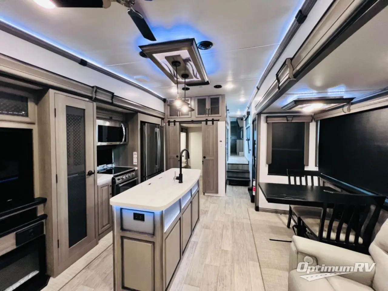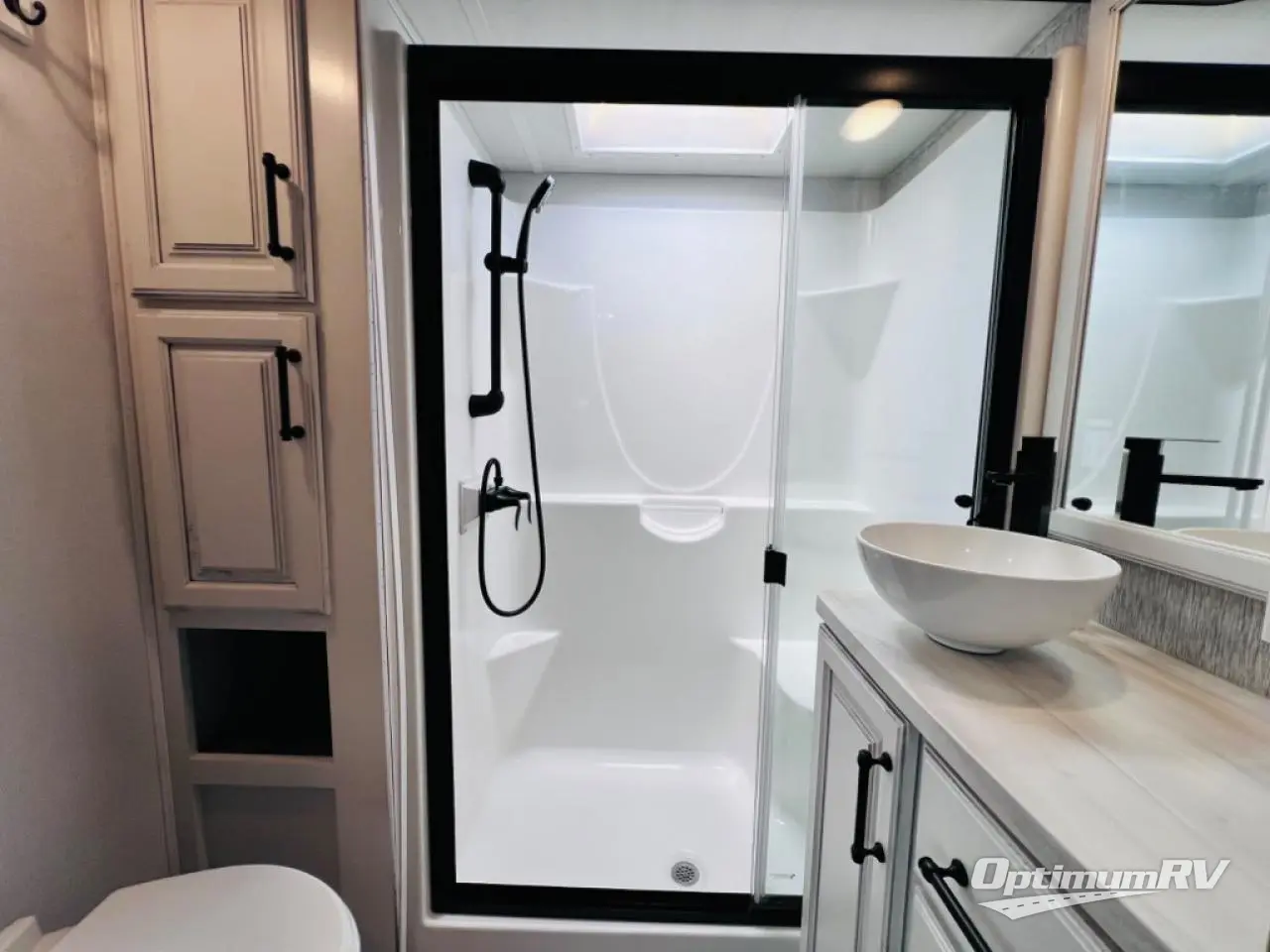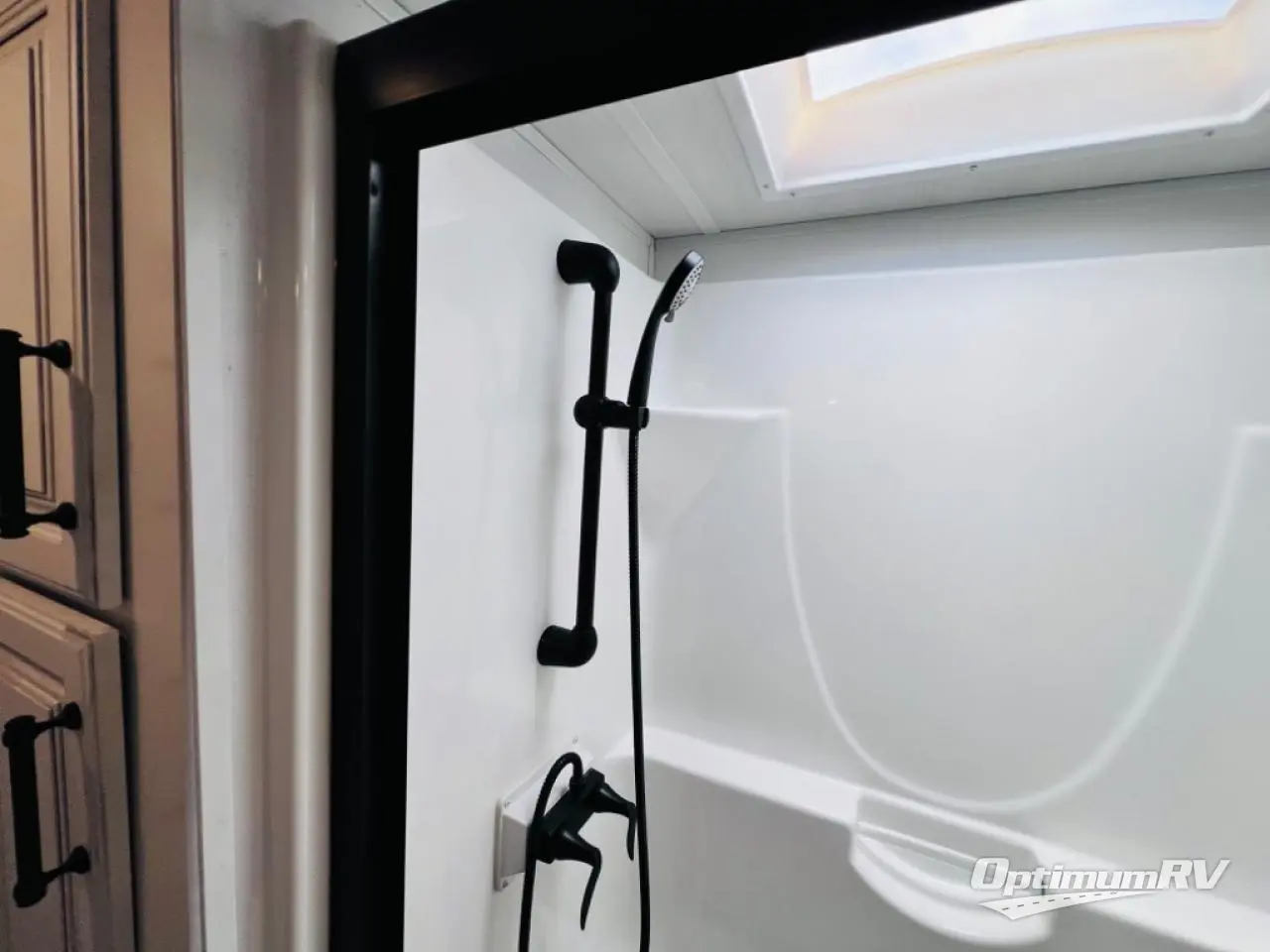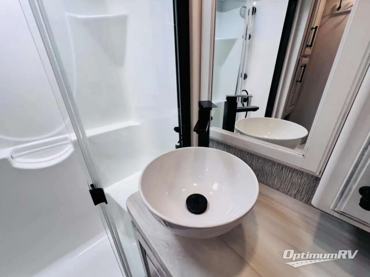 Everyone will have a comfortable place to sleep with two bedrooms in this fifth wheel! The front private bedroom has a king bed slide with storage underneath, a dresser with a 32" LCD HDTV, and a large front closet with a clothing hamper and an area prepped to add the optional stackable washer and dryer. The bonus room has a hide-a-bed sofa across from a desk so you can get some work done while you're away, plus a loft area/attic space above it all with a ladder to access it. The full bathroom has a 48" x 30" fiberglass shower with a seat and skylight above and a linen closet to keep your towels close. The chef can prepare delicious home cooked meals for everyone either indoors with the glass top range or at the outdoor kitchen with a two burner cooktop and refrigerator to keep your drink nice and cold!
