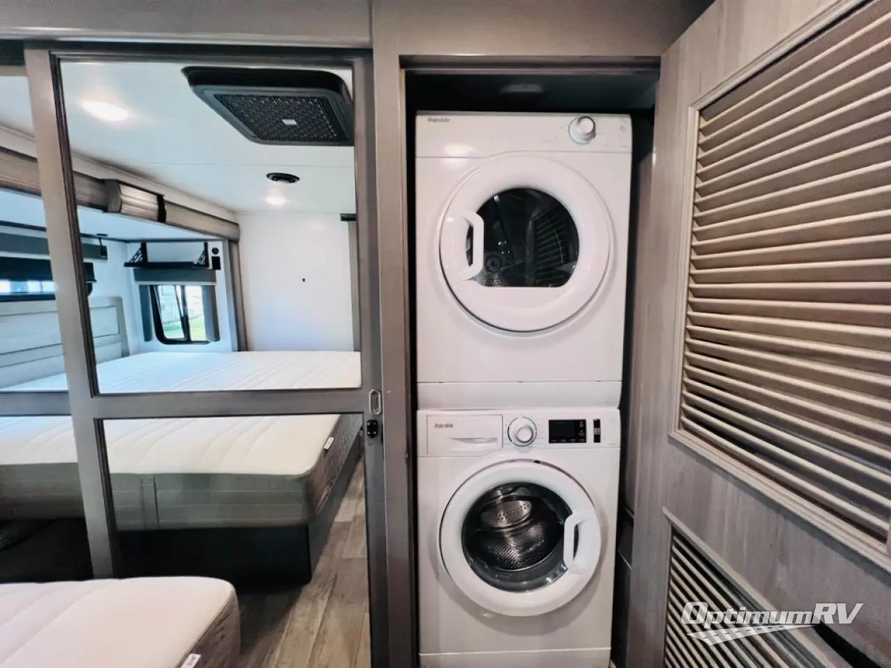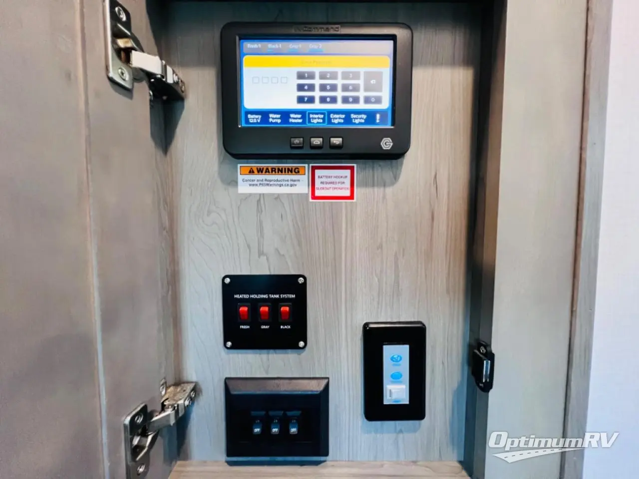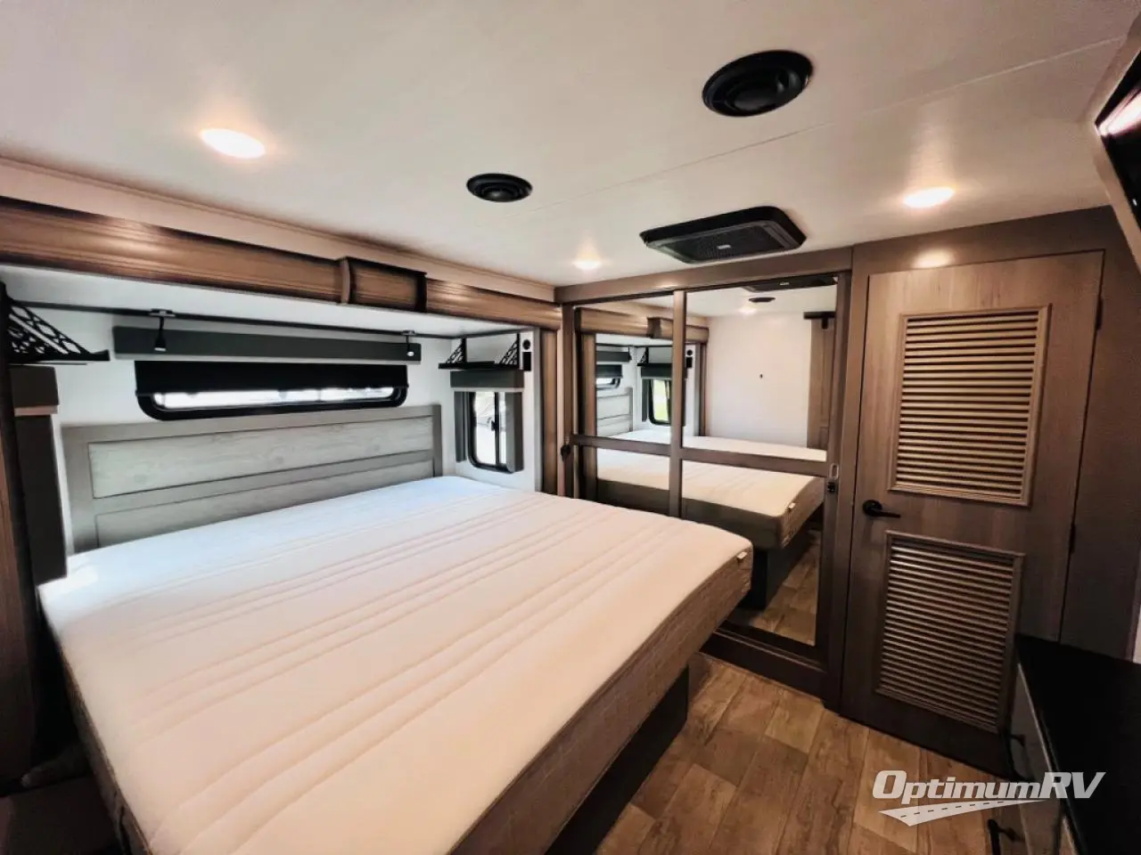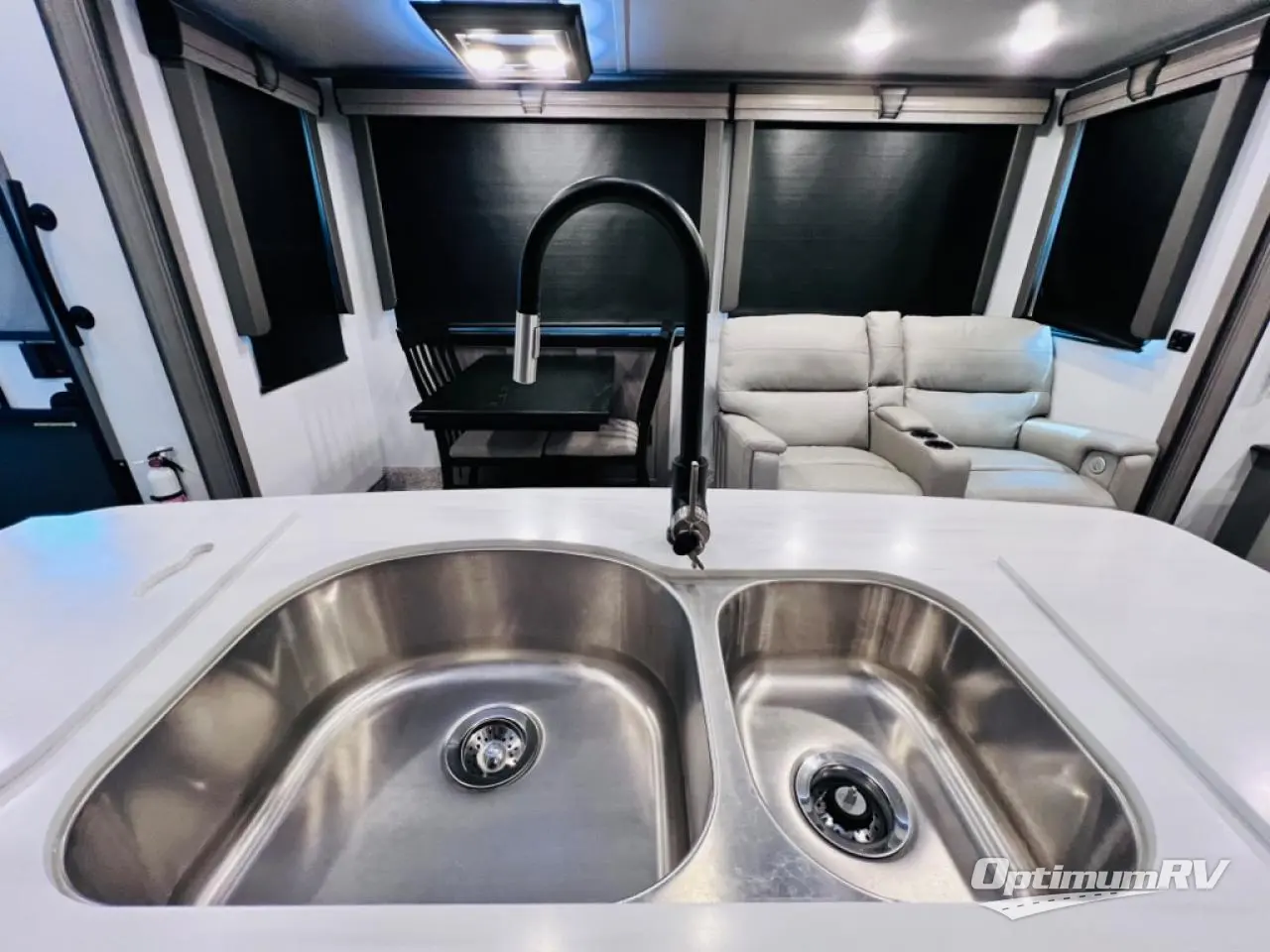 Everyone will have a comfortable place to sleep with two bedrooms in this fifth wheel! The front private bedroom has a king bed slide with storage underneath, a dresser with a 32" LCD HDTV, and a large front closet with a clothing hamper and an area prepped to add the optional stackable washer and dryer. The bonus room has a hide-a-bed sofa across from a desk so you can get some work done while you're away, plus a loft area/attic space above it all with a ladder to access it. The full bathroom has a 48" x 30" fiberglass shower with a seat and skylight above and a linen closet to keep your towels close. The chef can prepare delicious home cooked meals for everyone either indoors with the glass top range or at the outdoor kitchen with a two burner cooktop and refrigerator to keep your drink nice and cold!