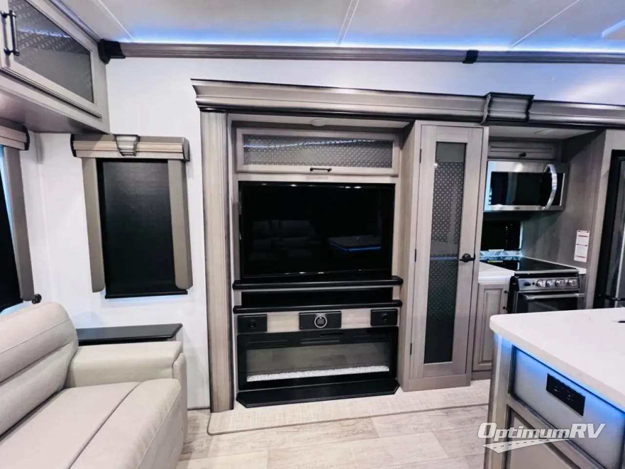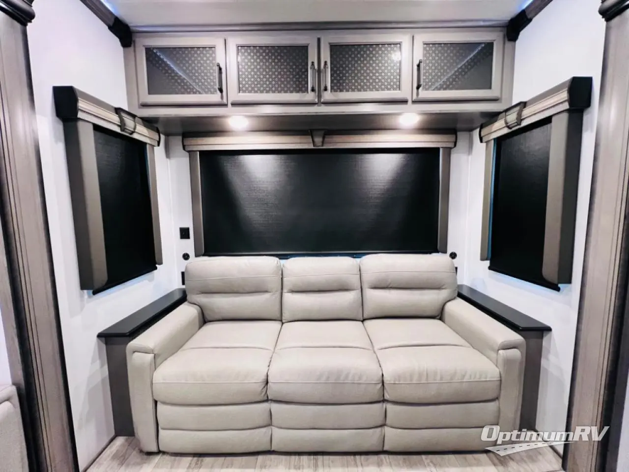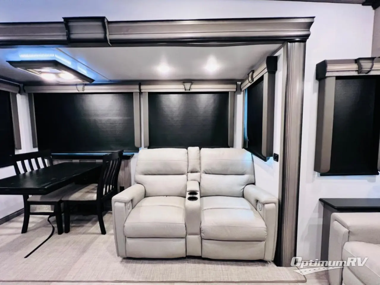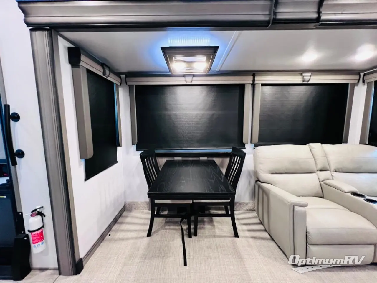 Everyone will have a comfortable place to sleep with two bedrooms in this fifth wheel! The front private bedroom has a king bed slide with storage underneath, a dresser with a 32" LCD HDTV, and a large front closet with a clothing hamper and an area prepped to add the optional stackable washer and dryer. The bonus room has a hide-a-bed sofa across from a desk so you can get some work done while you're away, plus a loft area/attic space above it all with a ladder to access it. The full bathroom has a 48" x 30" fiberglass shower with a seat and skylight above and a linen closet to keep your towels close. The chef can prepare delicious home cooked meals for everyone either indoors with the glass top range or at the outdoor kitchen with a two burner cooktop and refrigerator to keep your drink nice and cold!