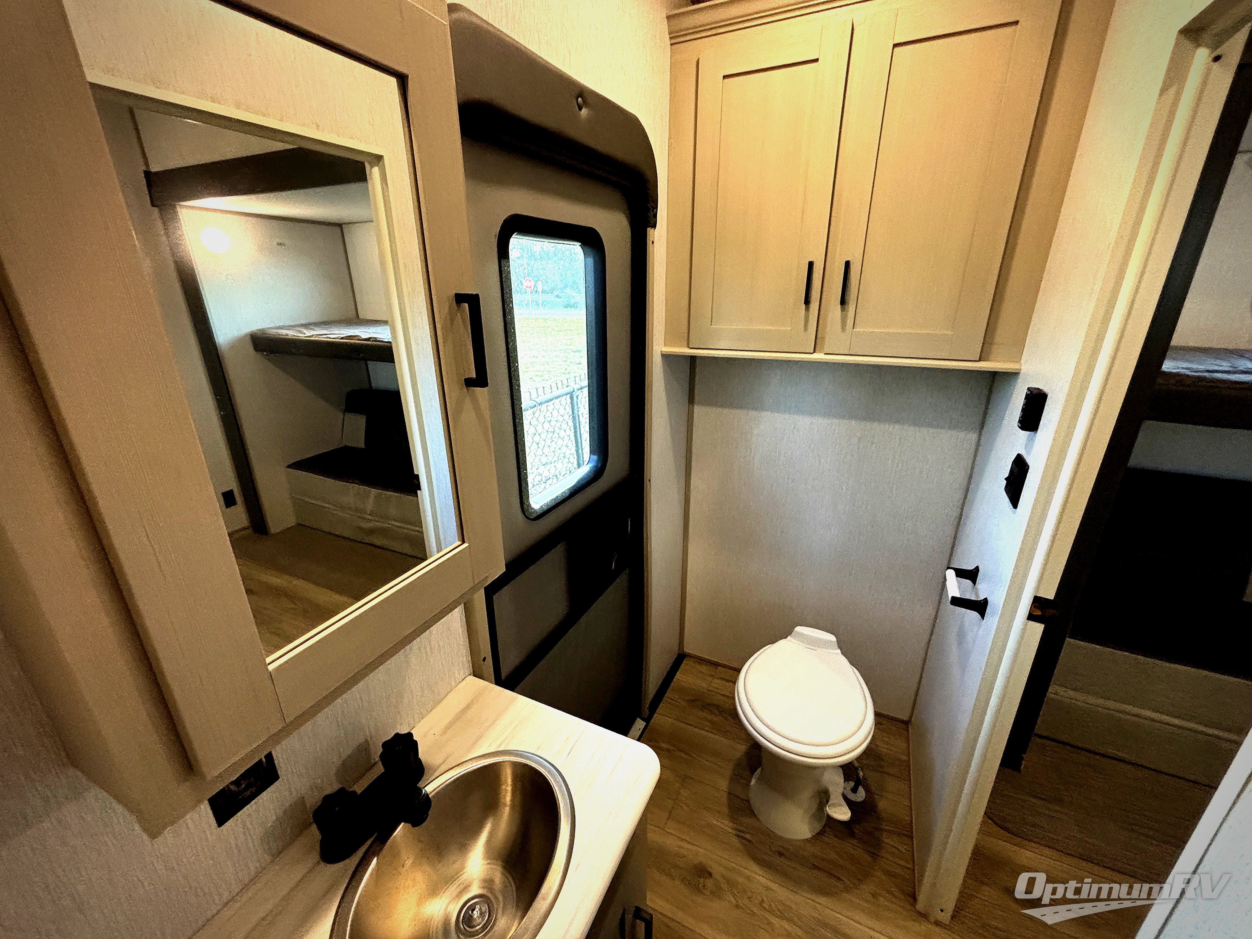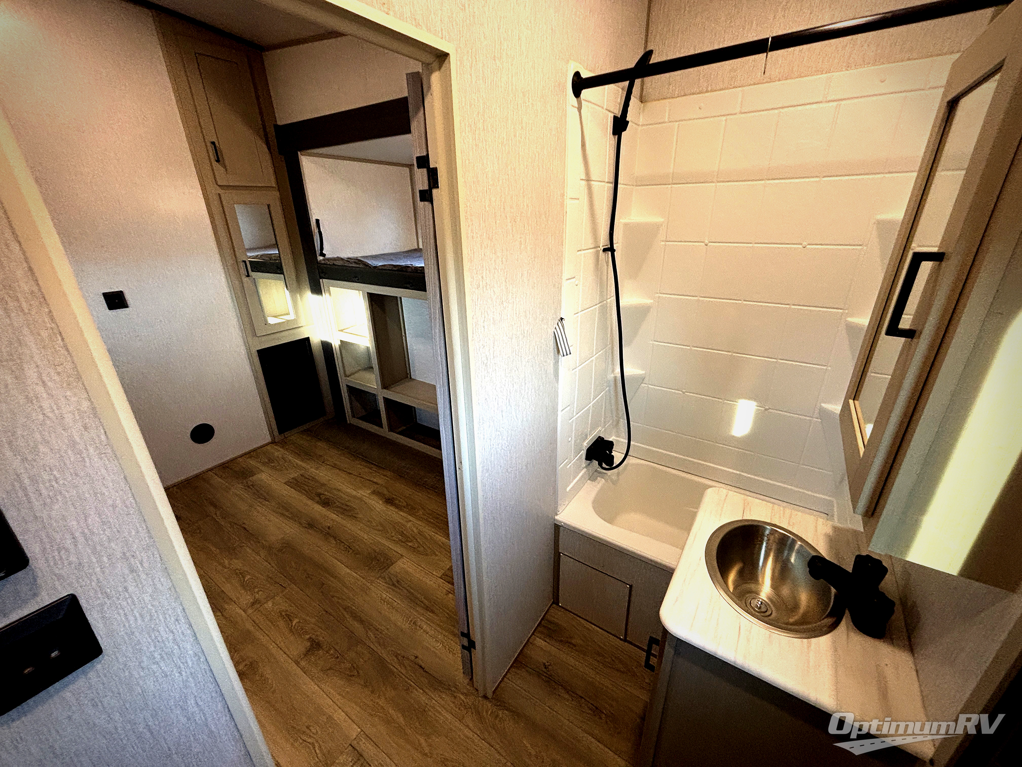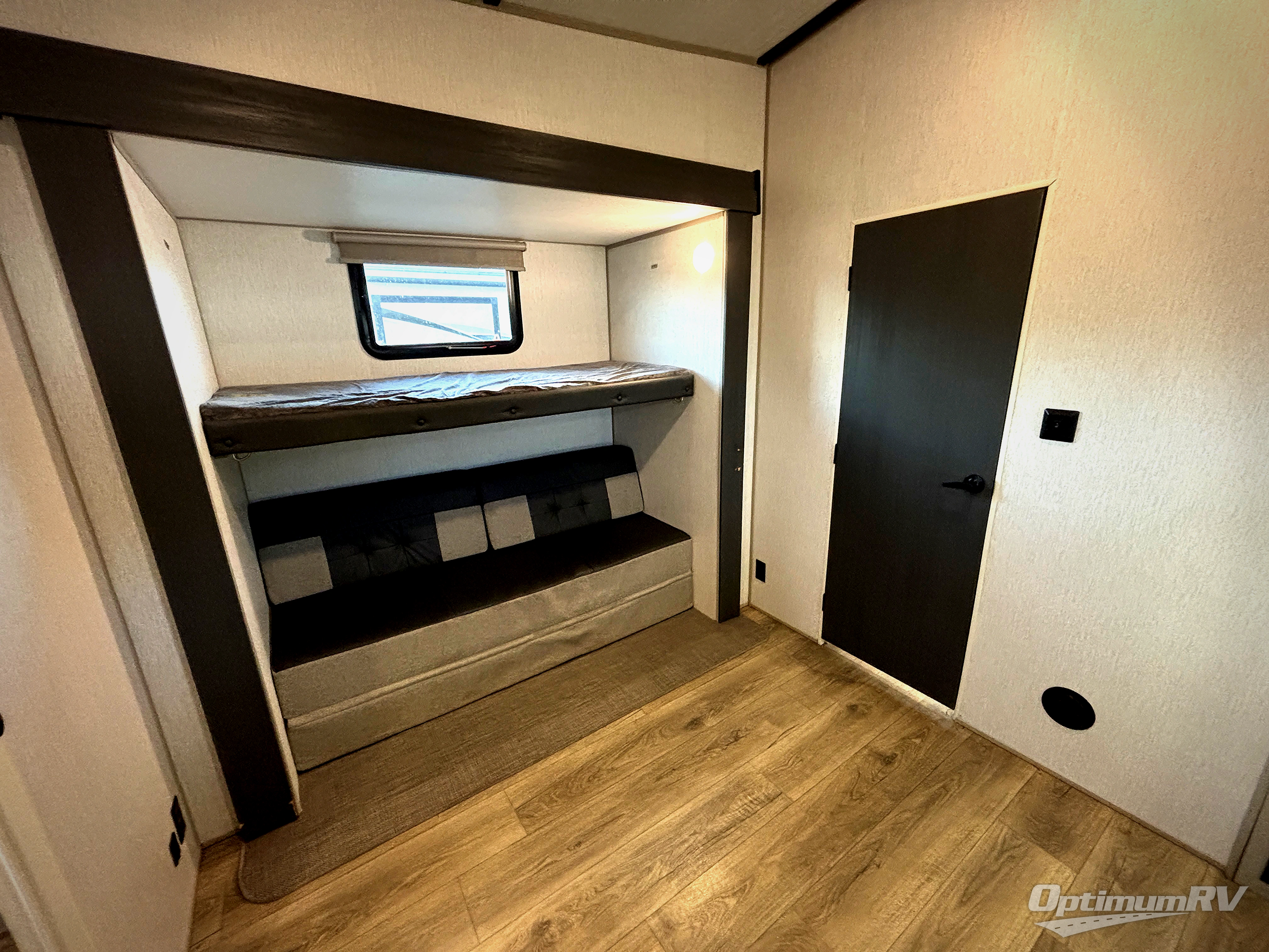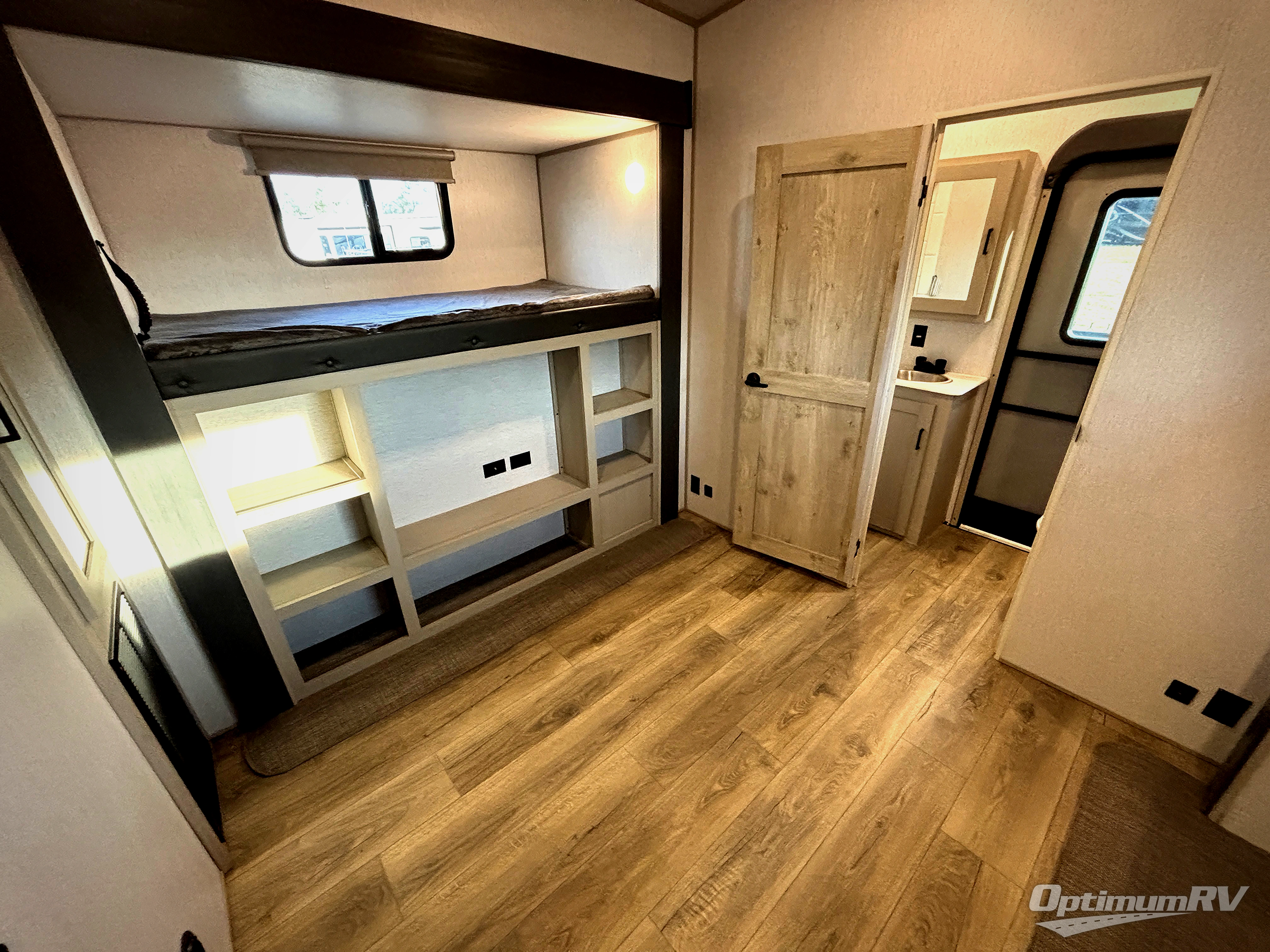 With two full bathrooms, everyone will stay clean in this fifth wheel! The double entry doors makes for a smooth flow of traffic and the unique rear entrance leads directly into the rear full bathroom. The private bunkhouse features not only one bunk above a Versa queen convertible bed/sofa, but also a second bunk above with storage. The U-shaped dinette is the perfect place for you to enjoy your meals at, play some card games and even transform into an extra sleeping space. The exterior has plenty of features you will love too like the outside kitchen/bar so you can have a good time cooking outdoors and a coax/TV hookup that you can add your own outside TV, plus an extra large pass-through storage area for your outdoor gear. When you're ready for bed, the custom king bed slide out will be waiting for you in the front private bedroom!
