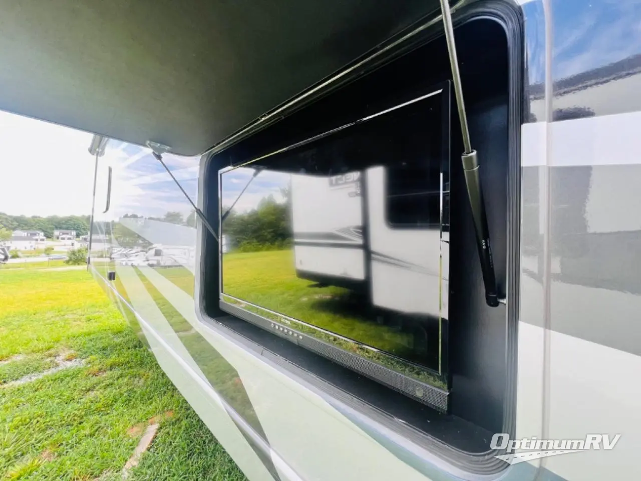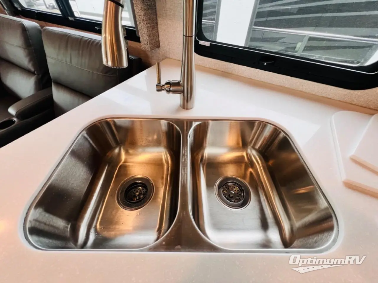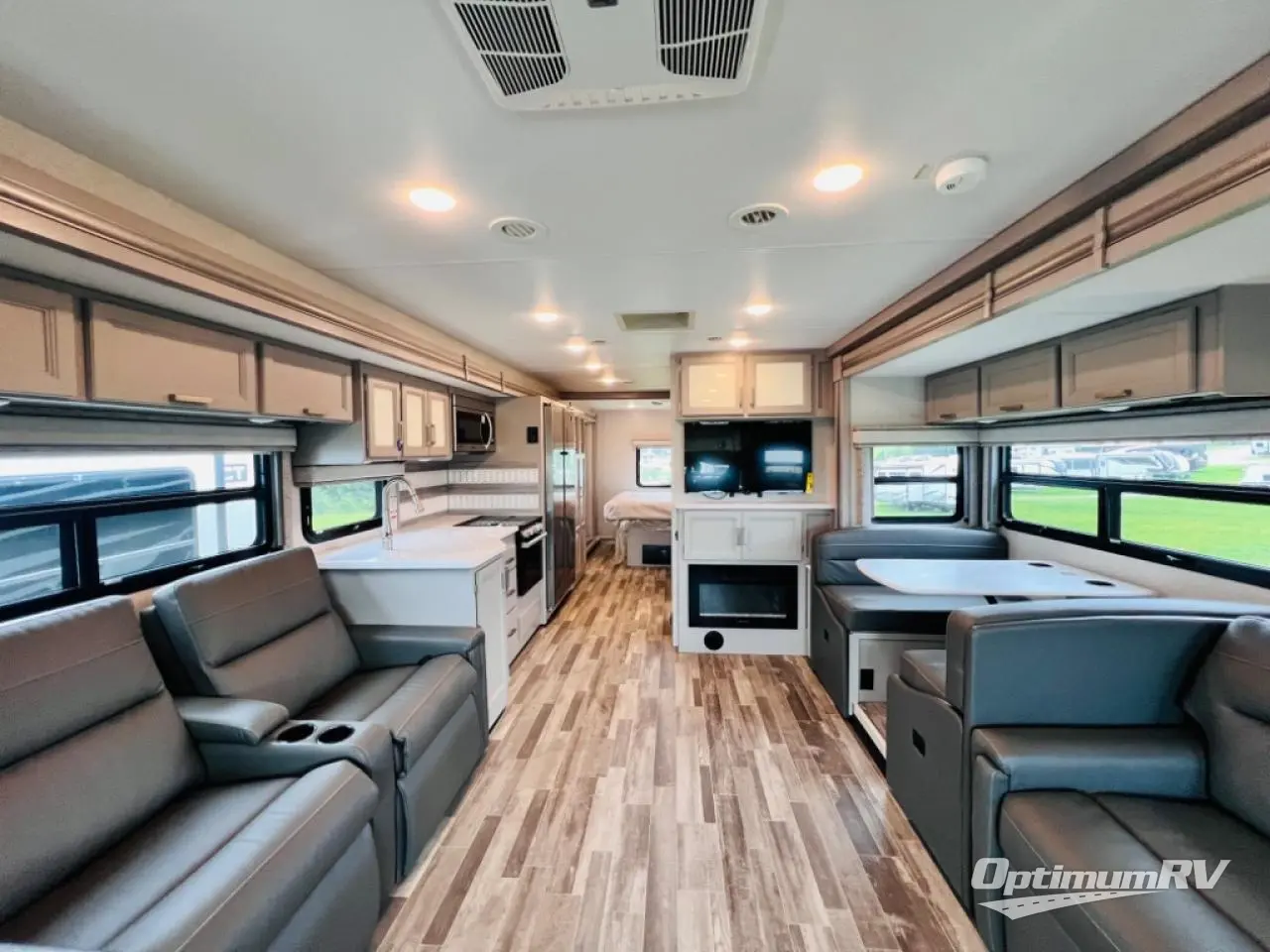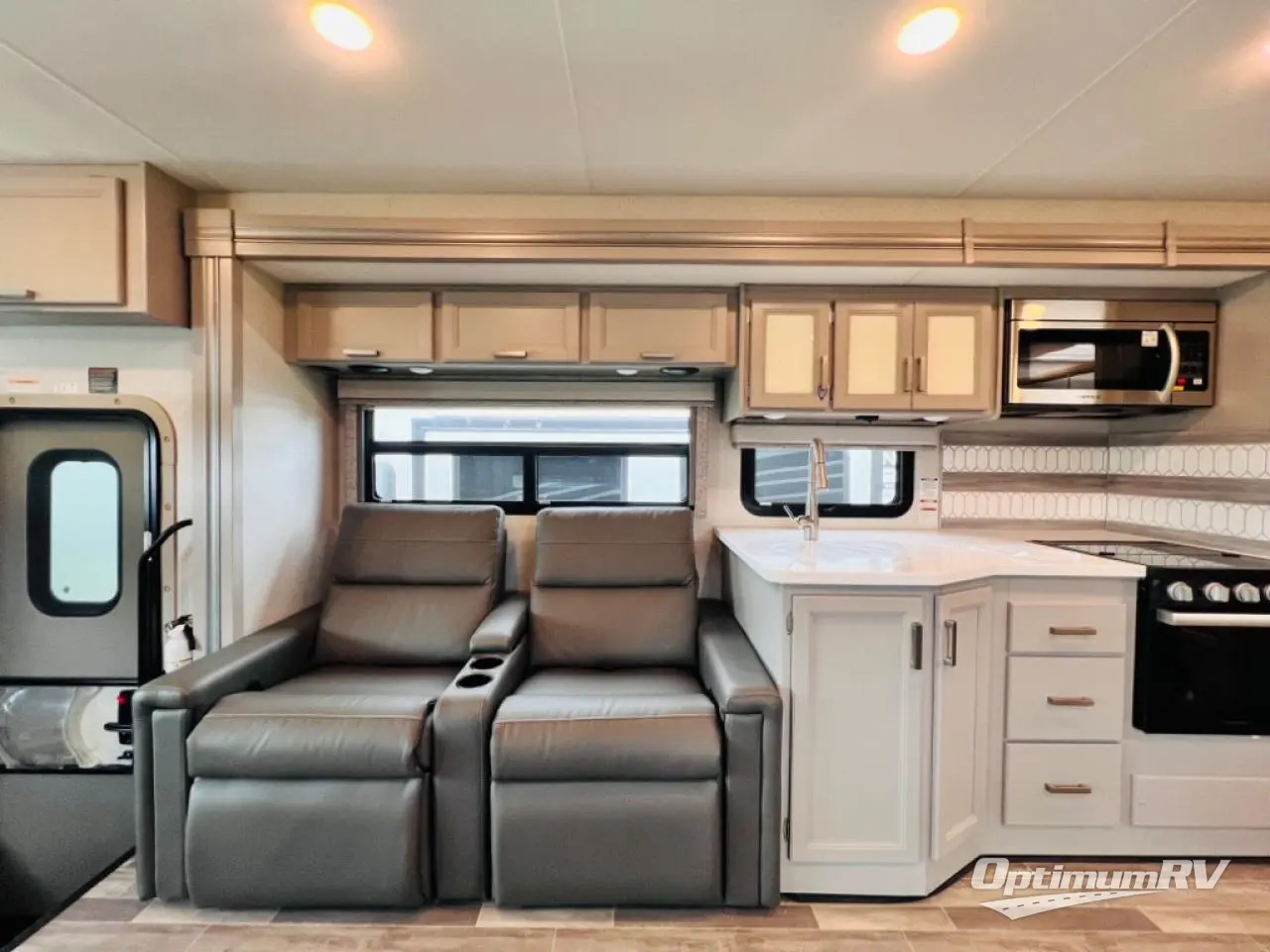 This spacious Class A motorhome has room to sleep eight! Enjoy the privacy of the rear king bedroom which has a spacious closet and a 32" LED TV. Extra guests can utilize the dream dinette, the sofa bed, or the drop-down overhead bunk which has a Cotton Cloud mattress for comfort. As if that's not enough, there's a pair of leatherette theater seats with footrests so you can kick back and watch either of the two living room TVs. You'll also find another TV outside. A full bath with 30" x 36" shower is conveniently located in the center so everyone has access, and the glass shower door and skylight make it feel roomy. The kitchen features a three-burner gas cooktop and oven, refrigerator, stainless steel convection microwave, and pantry.
