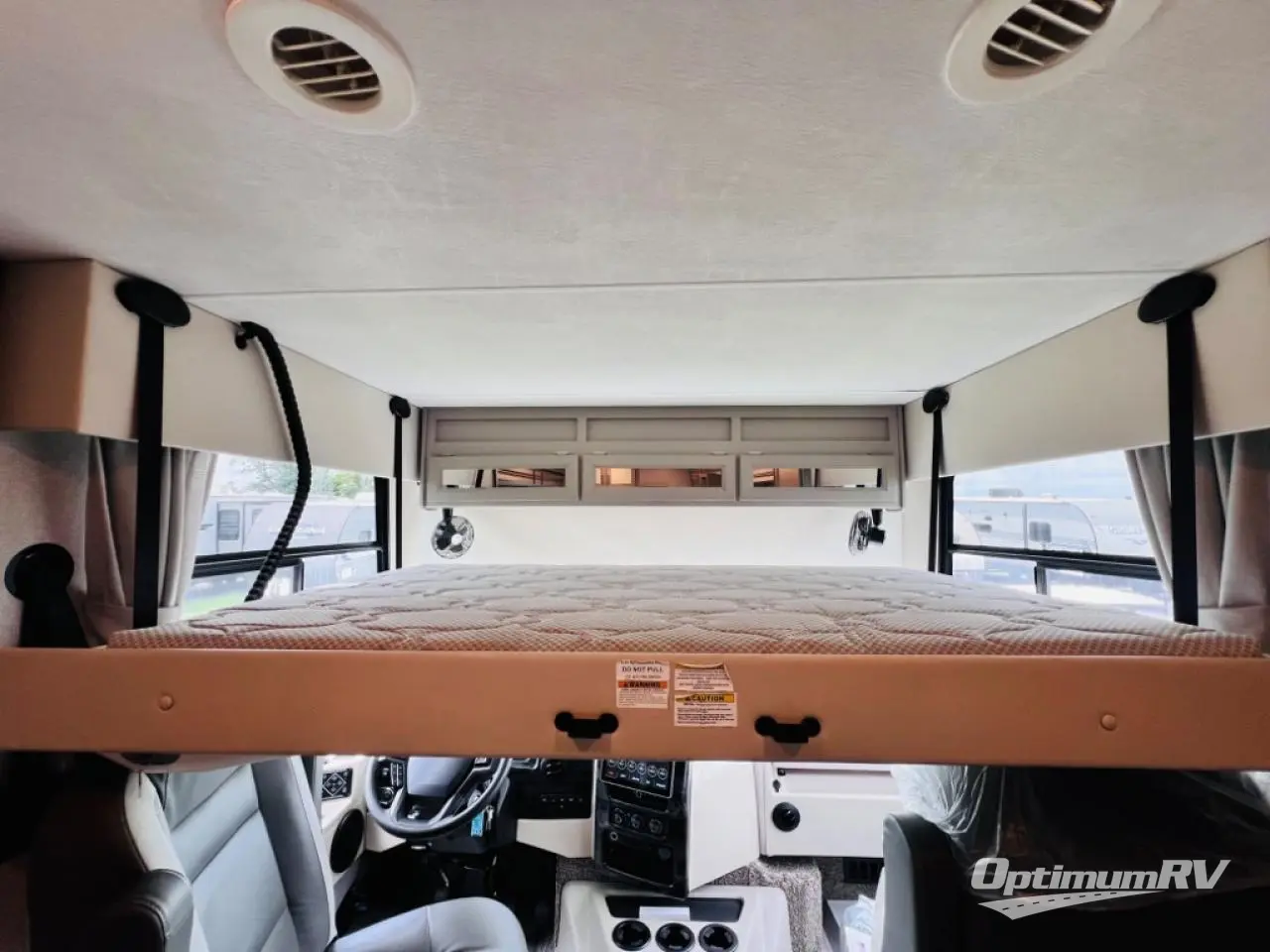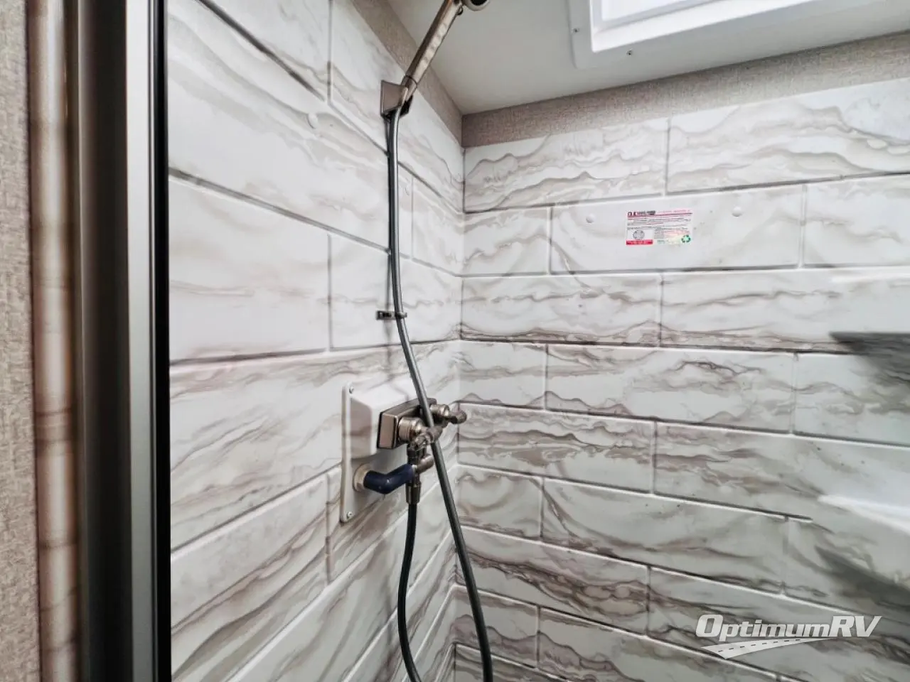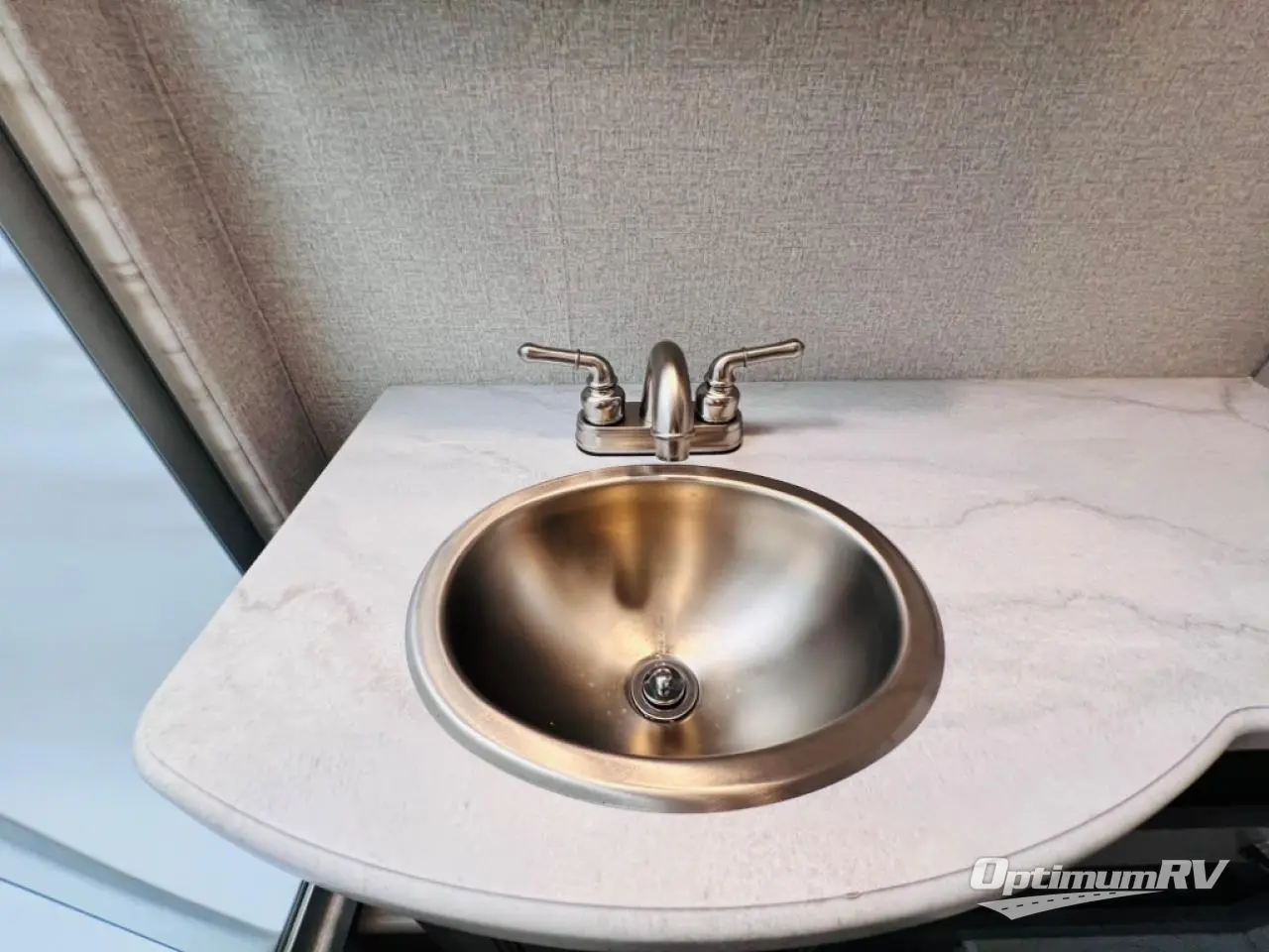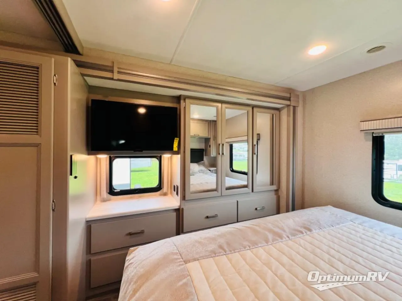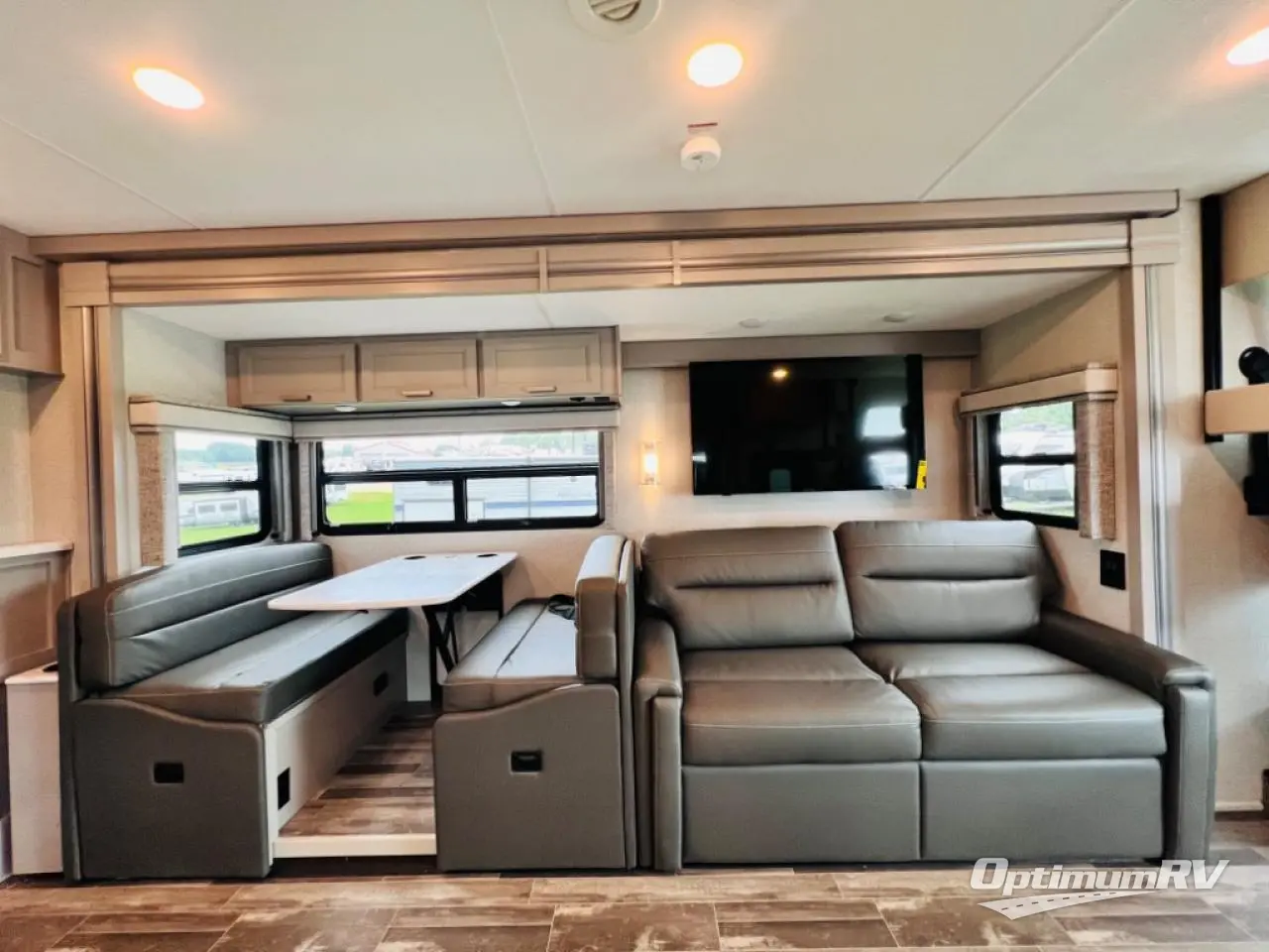 This spacious Class A motorhome has room to sleep eight! Enjoy the privacy of the rear king bedroom which has a spacious closet and a 32" LED TV. Extra guests can utilize the dream dinette, the sofa bed, or the drop-down overhead bunk which has a Cotton Cloud mattress for comfort. As if that's not enough, there's a pair of leatherette theater seats with footrests so you can kick back and watch either of the two living room TVs. You'll also find another TV outside. A full bath with 30" x 36" shower is conveniently located in the center so everyone has access, and the glass shower door and skylight make it feel roomy. The kitchen features a three-burner gas cooktop and oven, refrigerator, stainless steel convection microwave, and pantry.