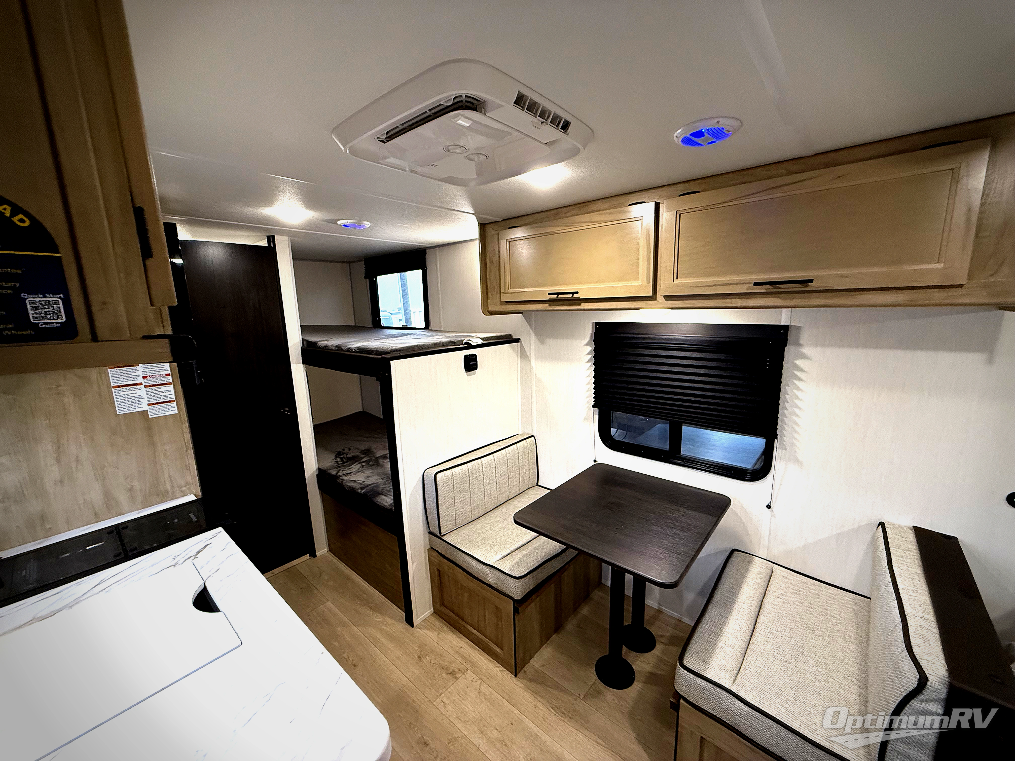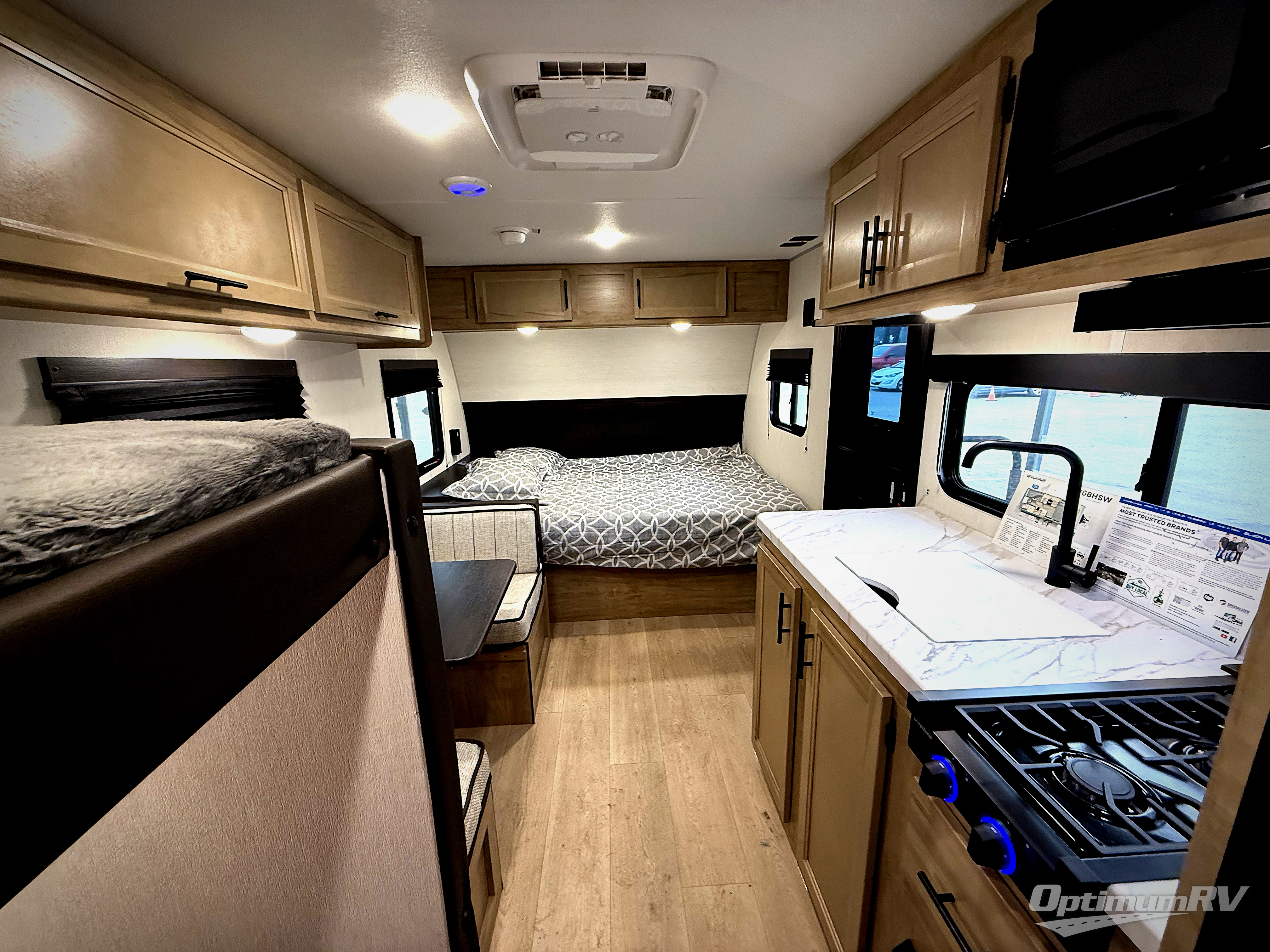 The whole family can sleep comfortably in this travel trailer! It has a set of bunk beds for the kids to sleep on, and you can sleep comfortably on the front queen bed with overhead cabinets and a shelf. There is even an exterior storage plus door that accesses the storage space under the bottom bunk. The chef will enjoy preparing their best home cooked meals either indoors with the high output cooktop or at the outside mini kitchen while staying protected by the 12' power awning!